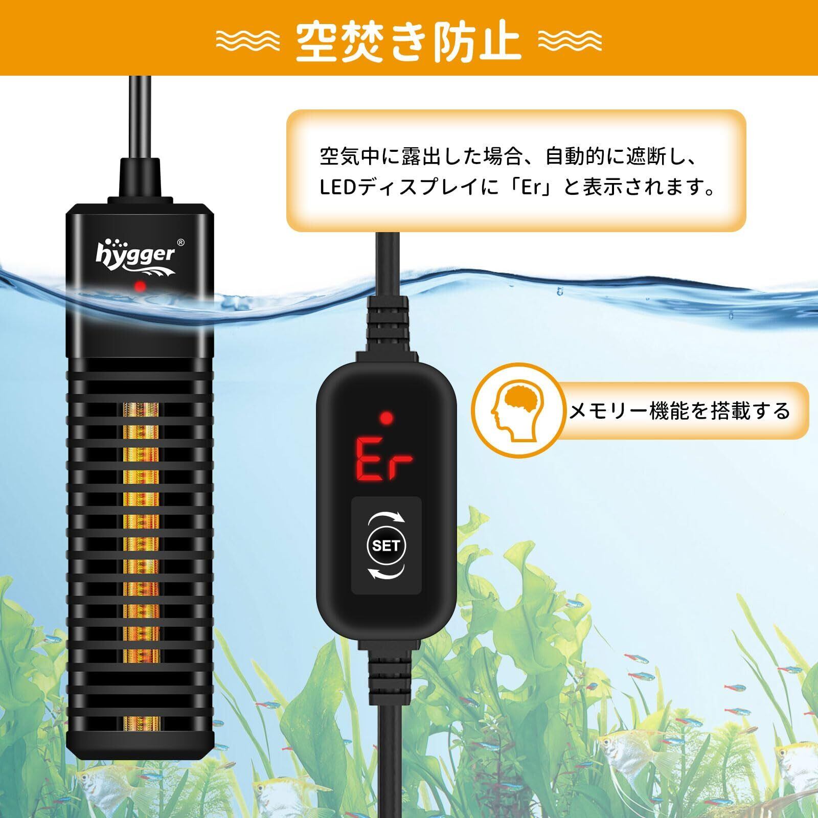 【空焚き防止】水槽ヒーターは、空焚き防止のために、低水位自動停止や過熱/過冷却保護などの安全機能を搭載しています。ヒーターが空気中に露出した場合、自動的に遮断し、LEDディスプレイに「Er」と表示されます。また、温度が36℃以上/12℃以下に達した場合も、ヒーターは自動的に遮断し、「EE」/「EU」と表示されてブザーアラームが鳴ります。