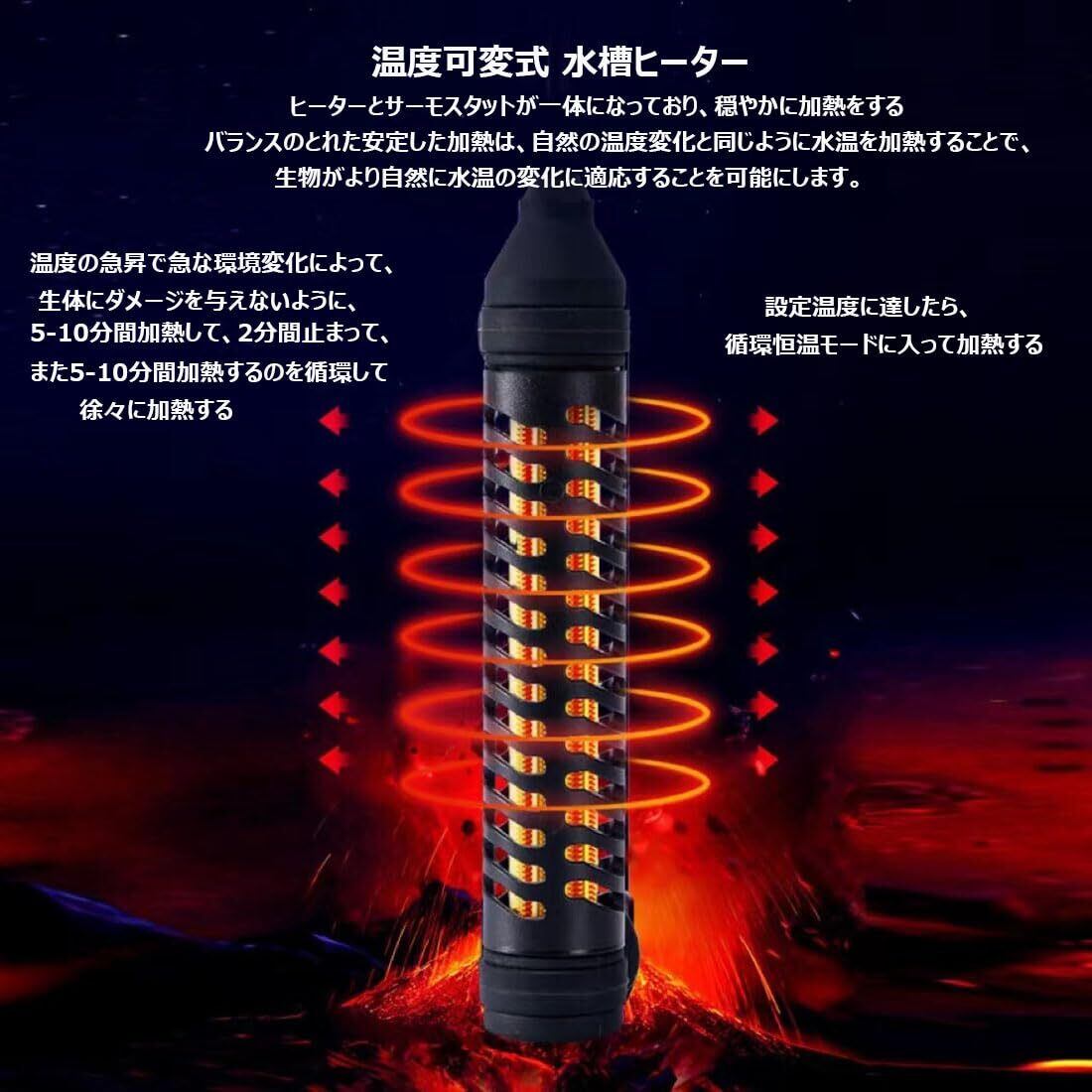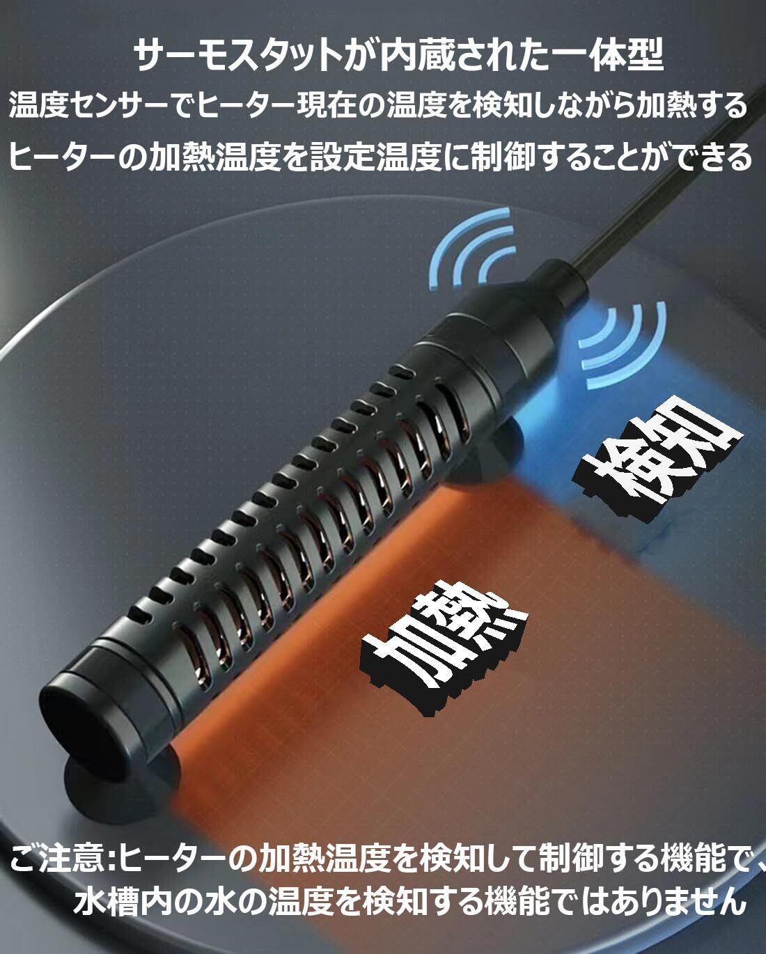 サーモスタット付き自動恒温式 :サーモスタットが内蔵された一体型のアクアリウム ヒーターです。生体にダメージ与えないように、温度センサーでヒーターの周りの水温を検知しながら、します、10分間加熱して2分間停止するのを繰り返すことにより、ヒーターの周りの水温が設定温度付近に保つことが可能になる。