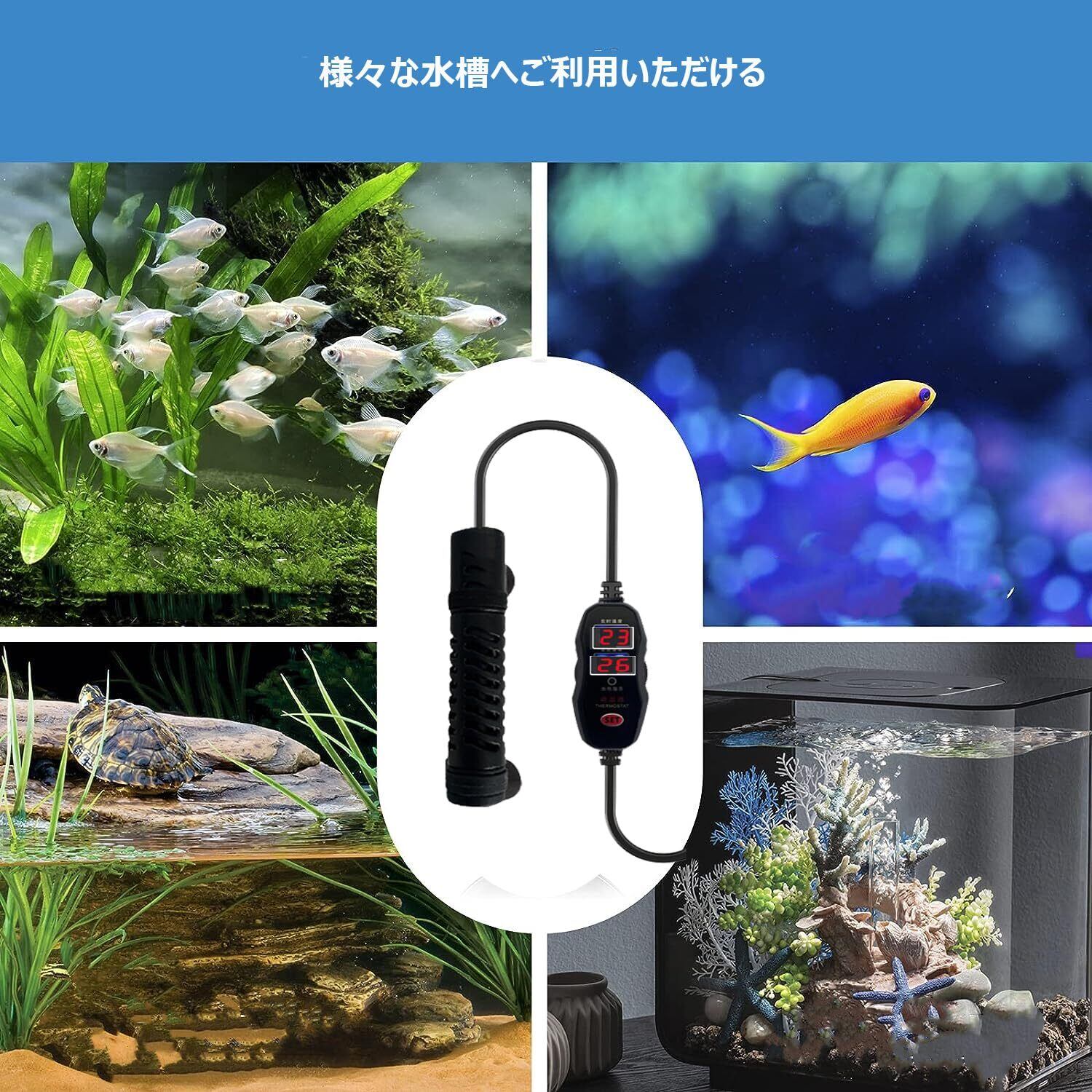 温度コントローラー:温度調整コントローラ付きで、飼育する魚の種類に応じて温度調整のコントローラーでご希望の温度を設定することができます、スタイリッシュで扱いやすく、耐久性も非常に高いです。