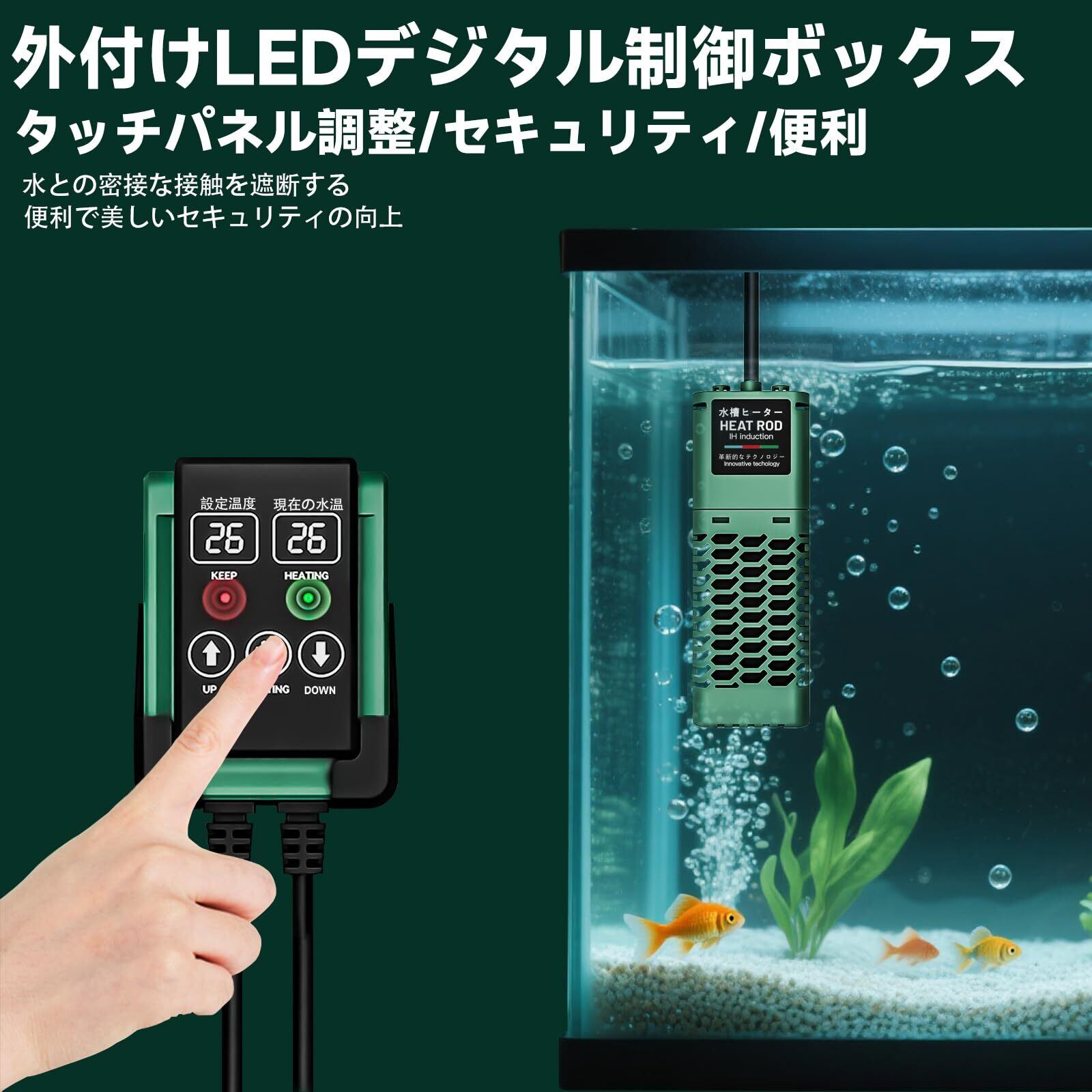 【多重安全機能】水に離れば・空焚き防止機能、異常加熱感知機能、過熱通電遮断保護機能、IPX8防水機能、自動保温機能など多重安全機能を搭載されています。異常加熱を感知すると自動的に電源やヒューズを切るような安全装置が搭載されています。また、万一の空焚き(空気中の加熱)時にはLEDディスプレイをErに表示し,加熱を停止することによりヒーターをより保護することができます。水槽の熱帯魚、ベタ、両生類、カメが全面的に保護されて、安全・安心ご使用ください。