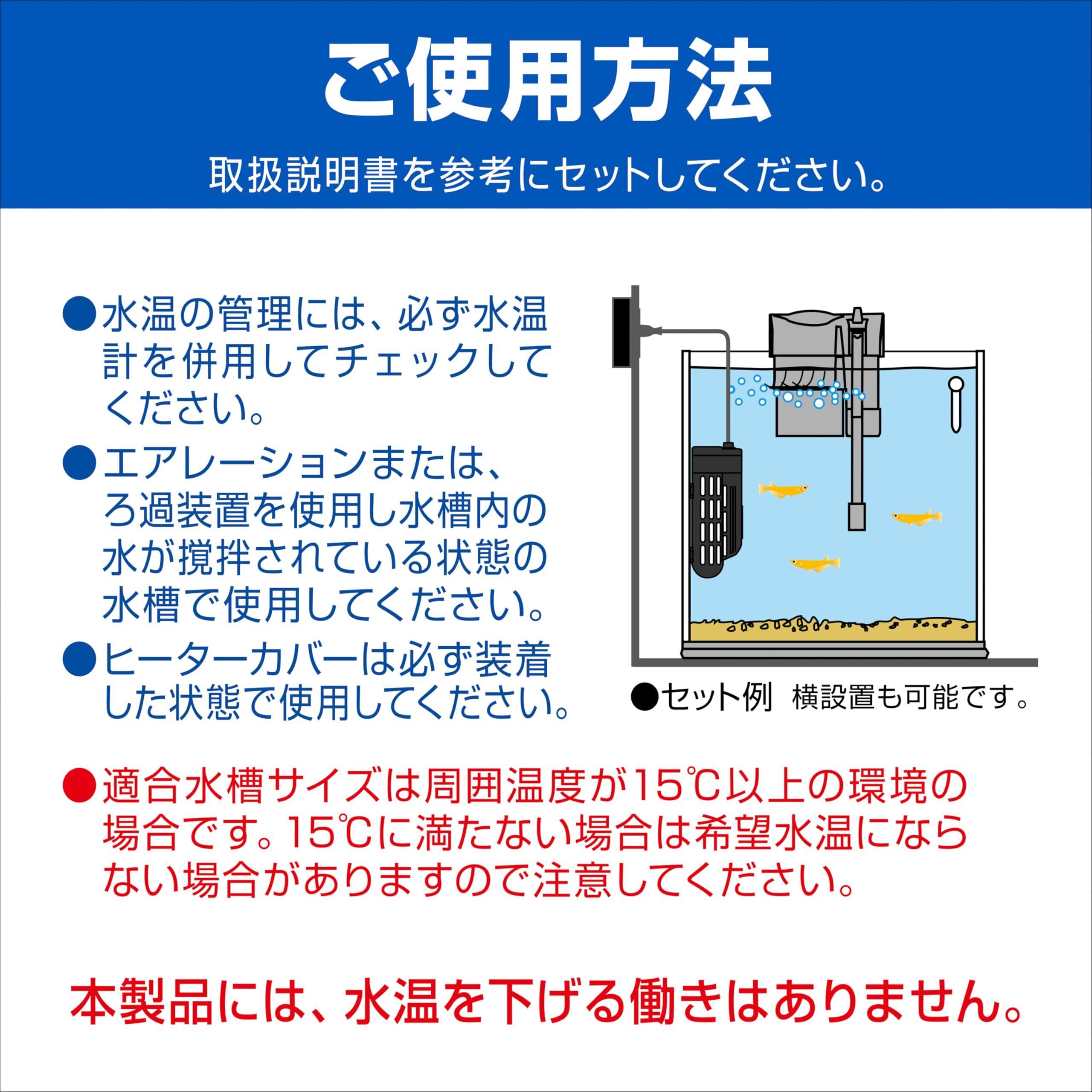 水温の管理には、必ず水温計を併用してチェックしてください ・本製品には、水温を下げる働きはありません ・エアレーション又は、ろ過装置を使用し水槽内の水が撹拌されている状態の水槽で使用してください ・適用水槽サイズは周囲温度が15℃以上の環境の場合です。15℃に満たない場合は希望水温にならない場合があります