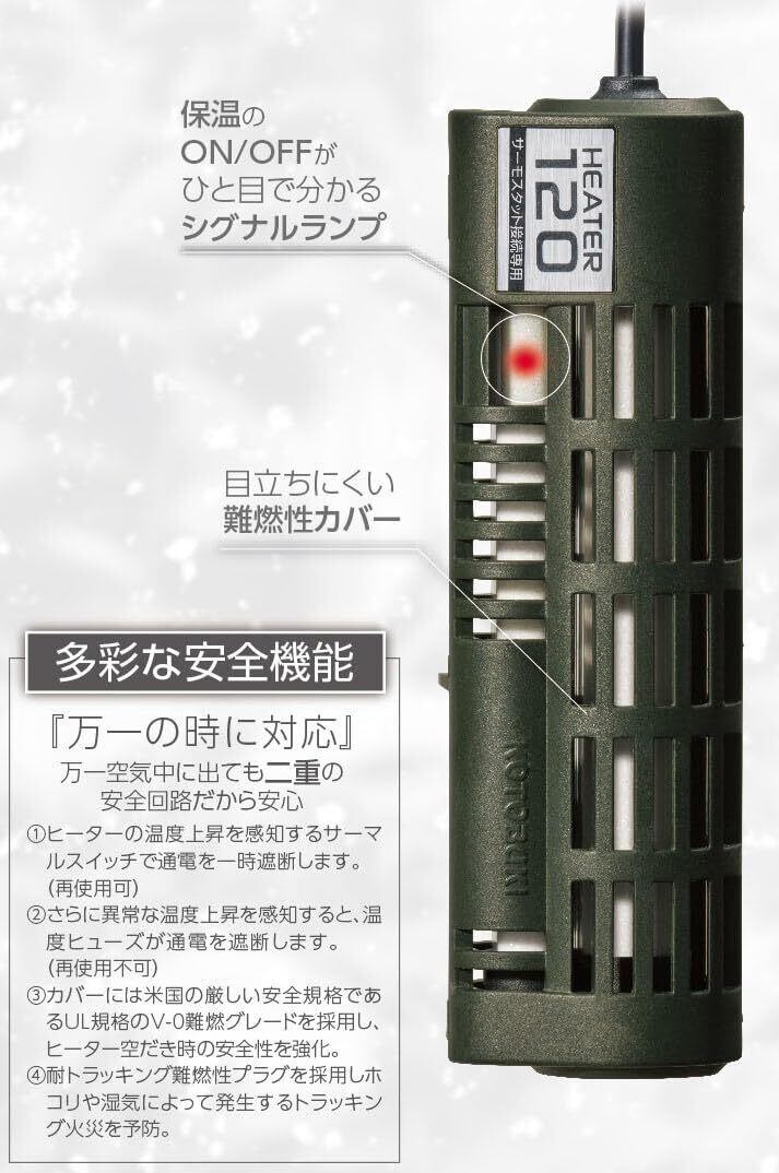 保温作動時がひと目で分かるシグナルランプ搭載・水槽内で目立ちにくい難燃性樹脂カバー