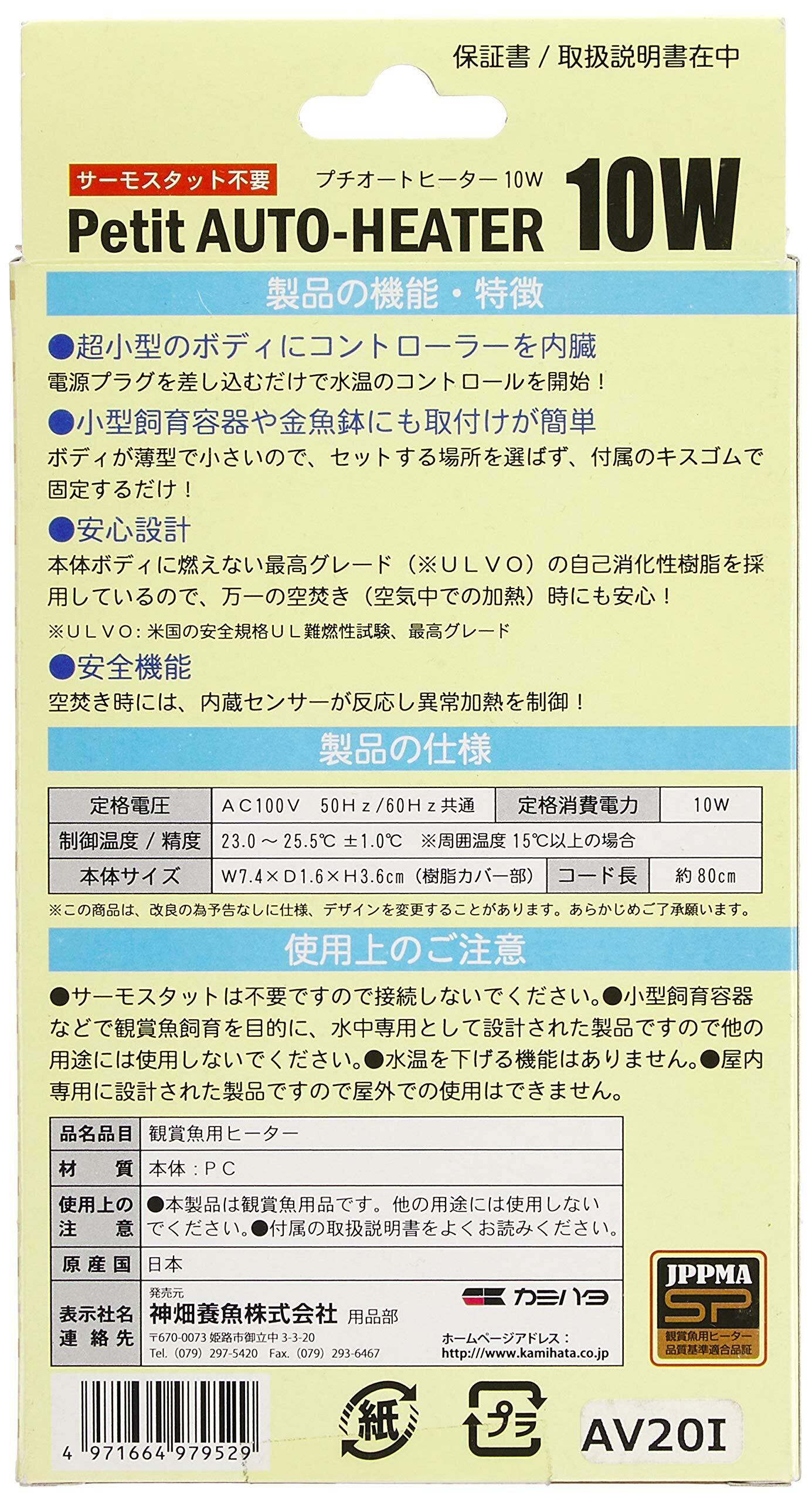 4リットルの水量まで対応できる、小型水槽での使用に適したオートヒーターです。●薄型で小さく、付属のキスゴムで簡単に取り付けることができます。●サーモスタットが不要で、本体を水槽などの飼育容器にセットし、電源プラグを差し込むだけで水温のコントロールを開始します。●異常過熱を防止するセンサーを内蔵し、本体ボディには、万一の空焚き(空気中での過熱)時にも安心の難燃性樹脂を採用しています。●定格消費電力:10W●制御温度・精度:23.0~25.5℃±1.0℃●コード長:約80cm