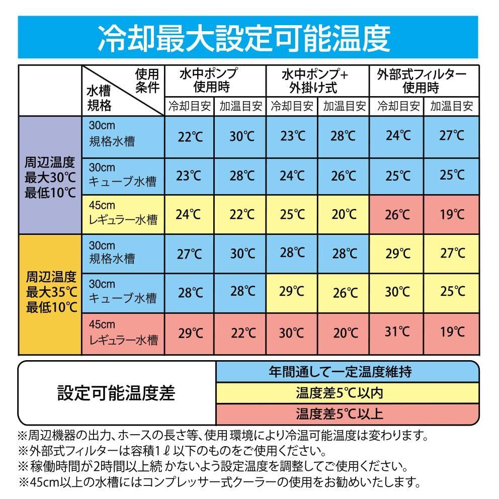 コンプレッサー式クーラーと違い、音の発生源はファンのみ。ファンは高性能部品を採用し稼動静音を抑制。音が気になりません。使用水槽の適合サイズ:小型水槽~40cm(35リットル)まで 淡水・海水使用可