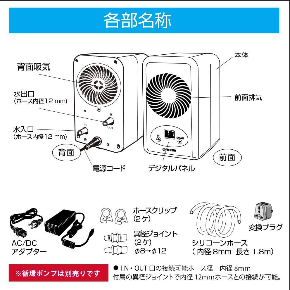 小型水槽向けペルチェ方式、冷却・加温両対応、適合流量 1.5~8.5 L/min、消費電力 90W、ホース内径 8mm、軽量・コンパクト設計。