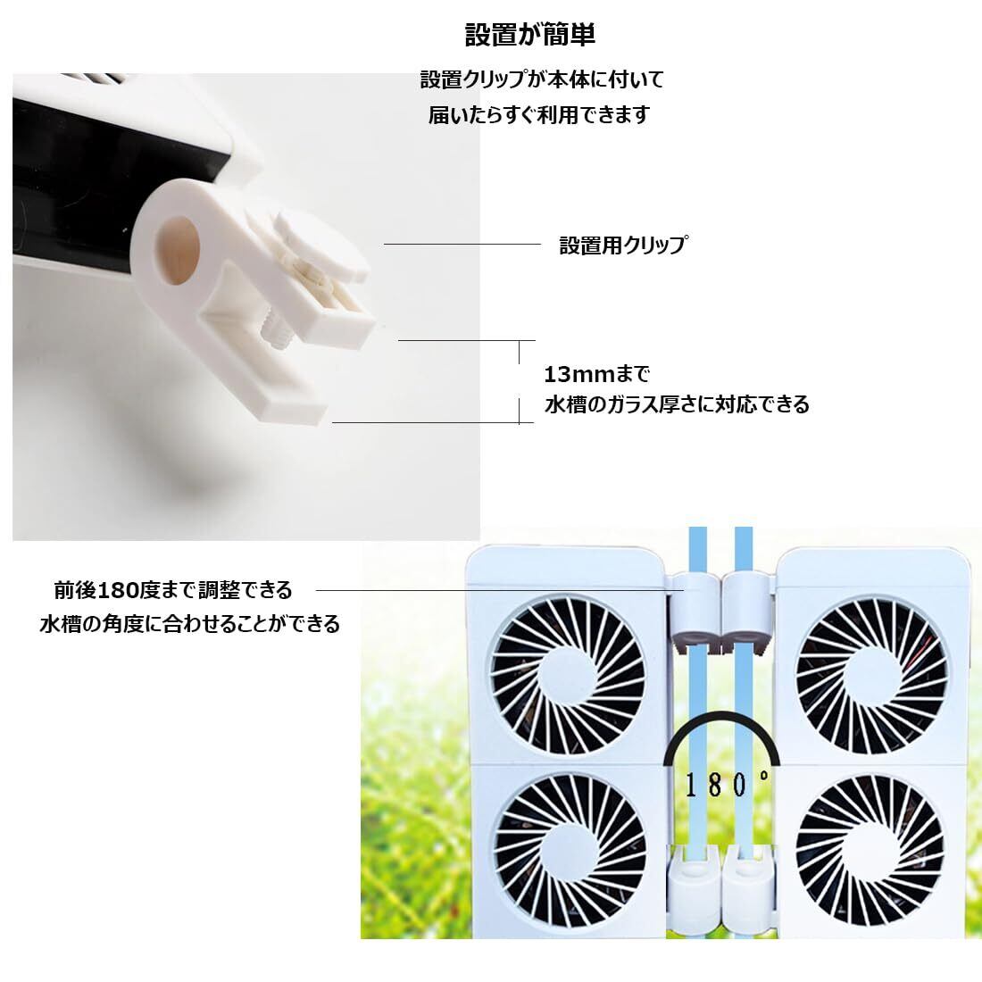 [水温上昇防止水槽用ファン]夏の水槽水温上昇防止に不可欠な水槽ファン、ファン本体に設置用クリップが付いてあり、お届いたらすぐに使用できる水槽ファンです。