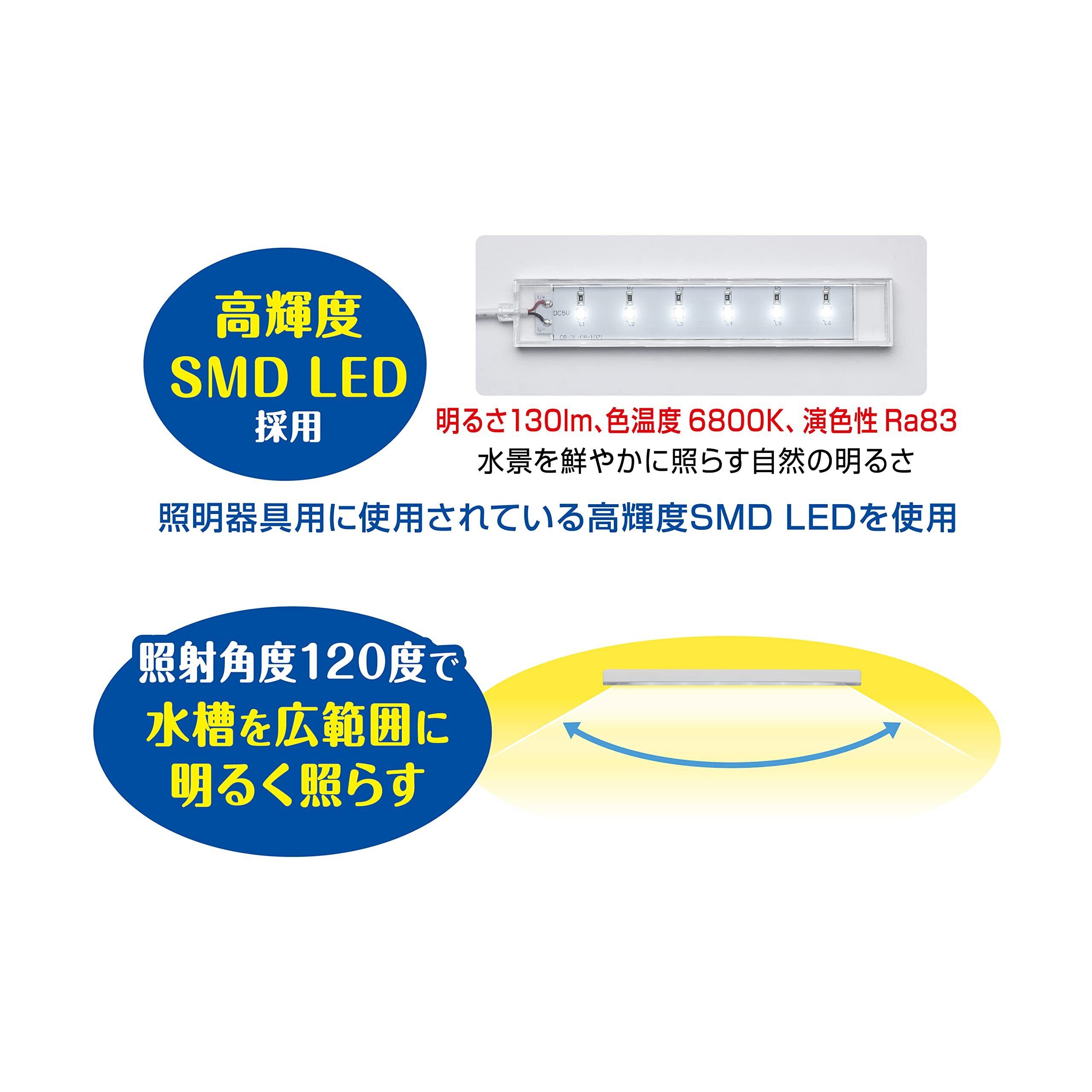 コンパクトで明るいスリム高輝度LED。厚さ8mm超コンパクトスリムボディ。水景を鮮やかに照らす自然の明るさで魚や水草を美しく魅せる。明るさ130lm、色温度6,800K、演色性Ra83。置き方自由自在!専用フタ「アクアカバー」(別売)でフラットにセット。水槽のフタに置いてもすべりにくいシリコンシート付で、フレームレス水槽にすっきり置ける。フレームレス水槽・枠付水槽に対応。コンパクト水槽用、幅40cm以下の水槽に最適。ON・OFFスイッチで操作が簡単。アタッチメントでの取り付けも可能。USB電源を採用。本製品にはUSBアダプターは付属していません。当社純正品(USBアダプターG-1A)もしくは市販のUSBアダプター(DC5V 1A以上)をお買い求めください。