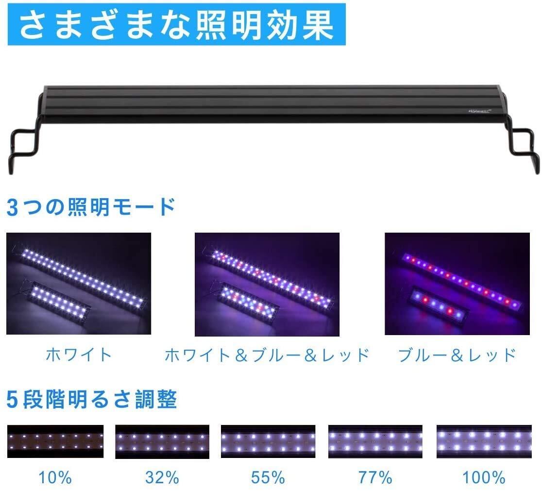 【明るさ調整可能】水槽用照明ライトはホワイト・ブルー・レッドの3種類の色の32個LEDビーズがある、3つの照明モードの変更で、魚、水草、水の究極の美しさを実現できます!また、5段階で光の明るさを調整できます。さまざまな照明効果を調整して、水槽に健康で活気がある環境を提供することができます。