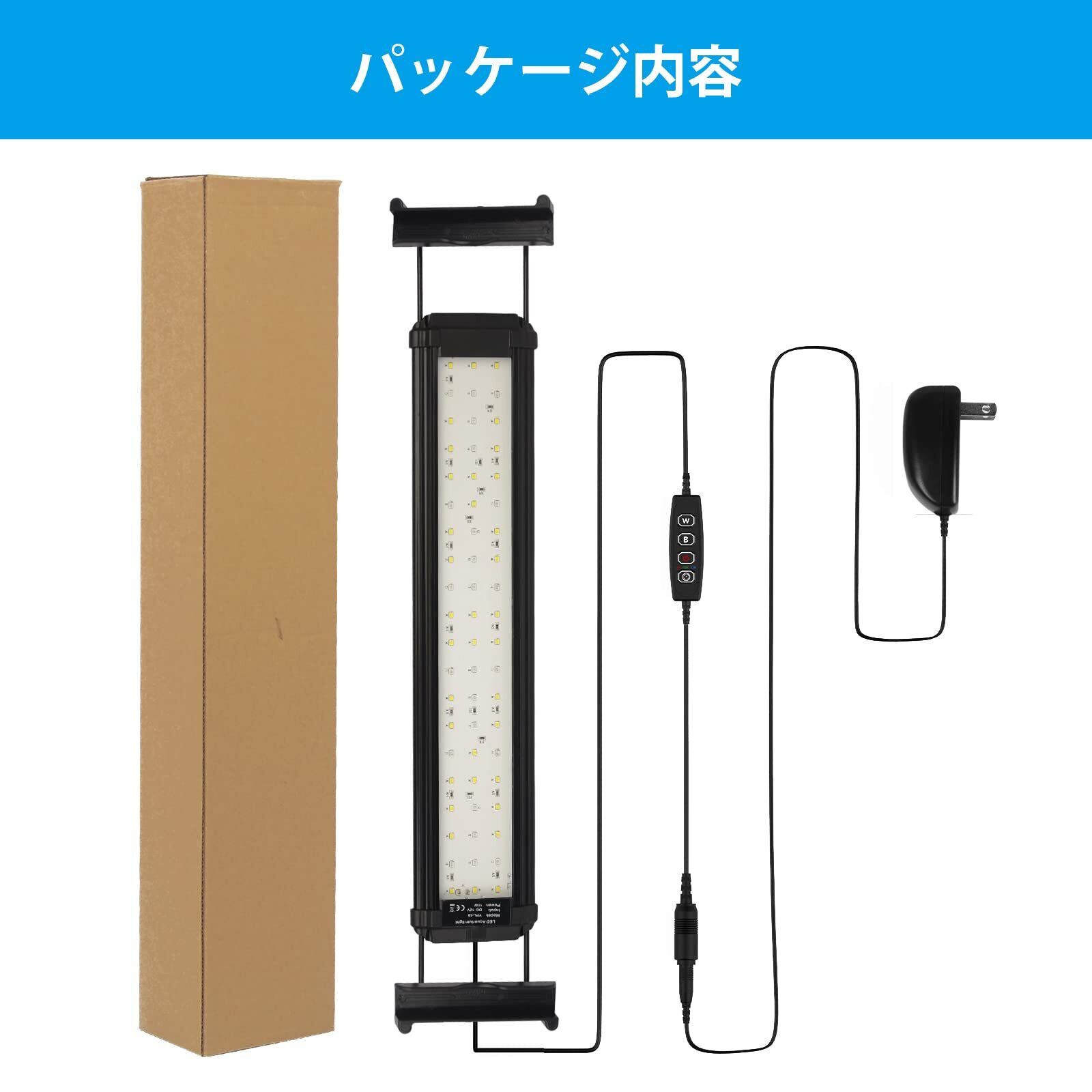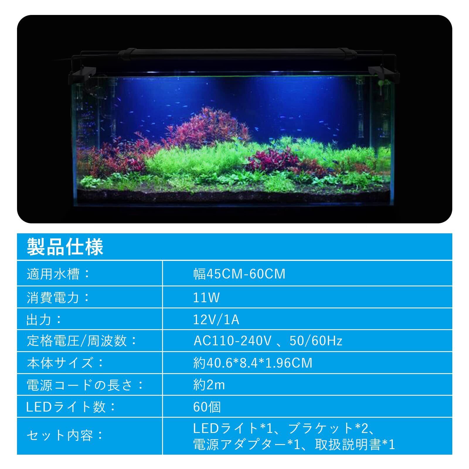 11W高輝度LEDライト60個、長寿命:led水槽ライトが60個高輝度LEDランプを採用し、ただ11wの低電力消費で省エネです。従来の水槽ライトと違い、照射は水槽の奥行き全体まで明るく照らす。LEDの光源の安定性がよく、物の本色が現れ、観賞魚を飼うことあや水草を育成することに最適です。