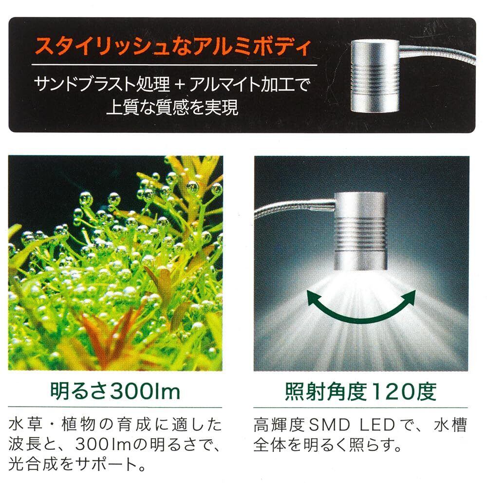 ガラス容器、グラスポット、小型水槽にぴったりのLEDライト! 取り付け部はフレームレス水槽にも対応。フレキシブルアームは長さ調整、角度調整が可能で、どんな容器にも最適な距離、角度で照らすことが可能です。色温度6,500Kによる自然でさわやかな光が、魚と緑を色鮮やかに照らします。