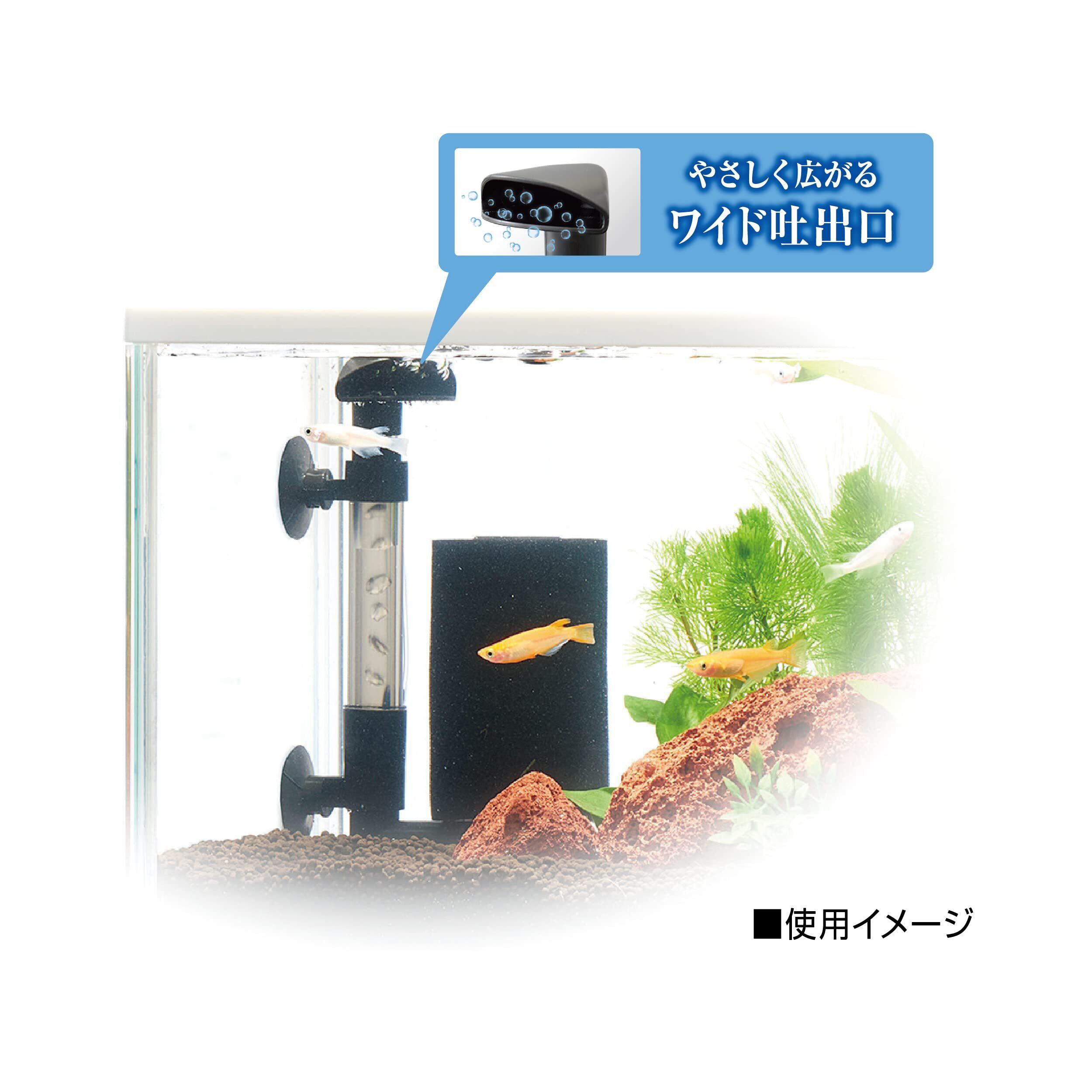 エアーをやさしく拡散させるワイド吐出口とエアー調節バルブで、メダカにやさしい水流をつくります。卵・稚魚を吸い込みにくい高密度スポンジ採用。