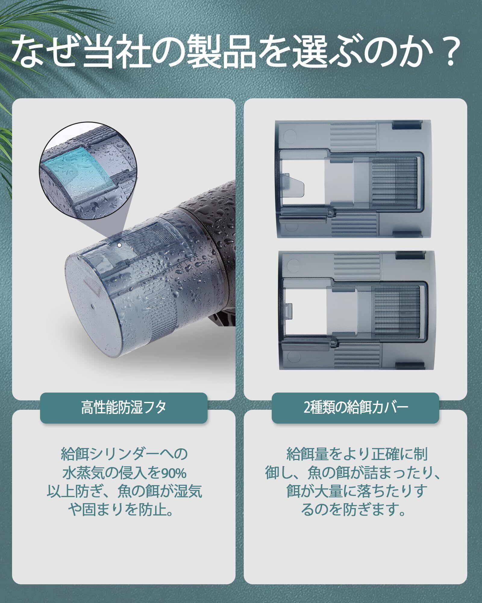 アップグレードされた防湿カバー:当社の魚自動餌やり機は最新の「防湿」設計を採用しており、水蒸気の90%以上を削減し、魚の餌の湿気と凝集を効果的に軽減し、魚の餌をドライでフレッシュな状態を保ちます。