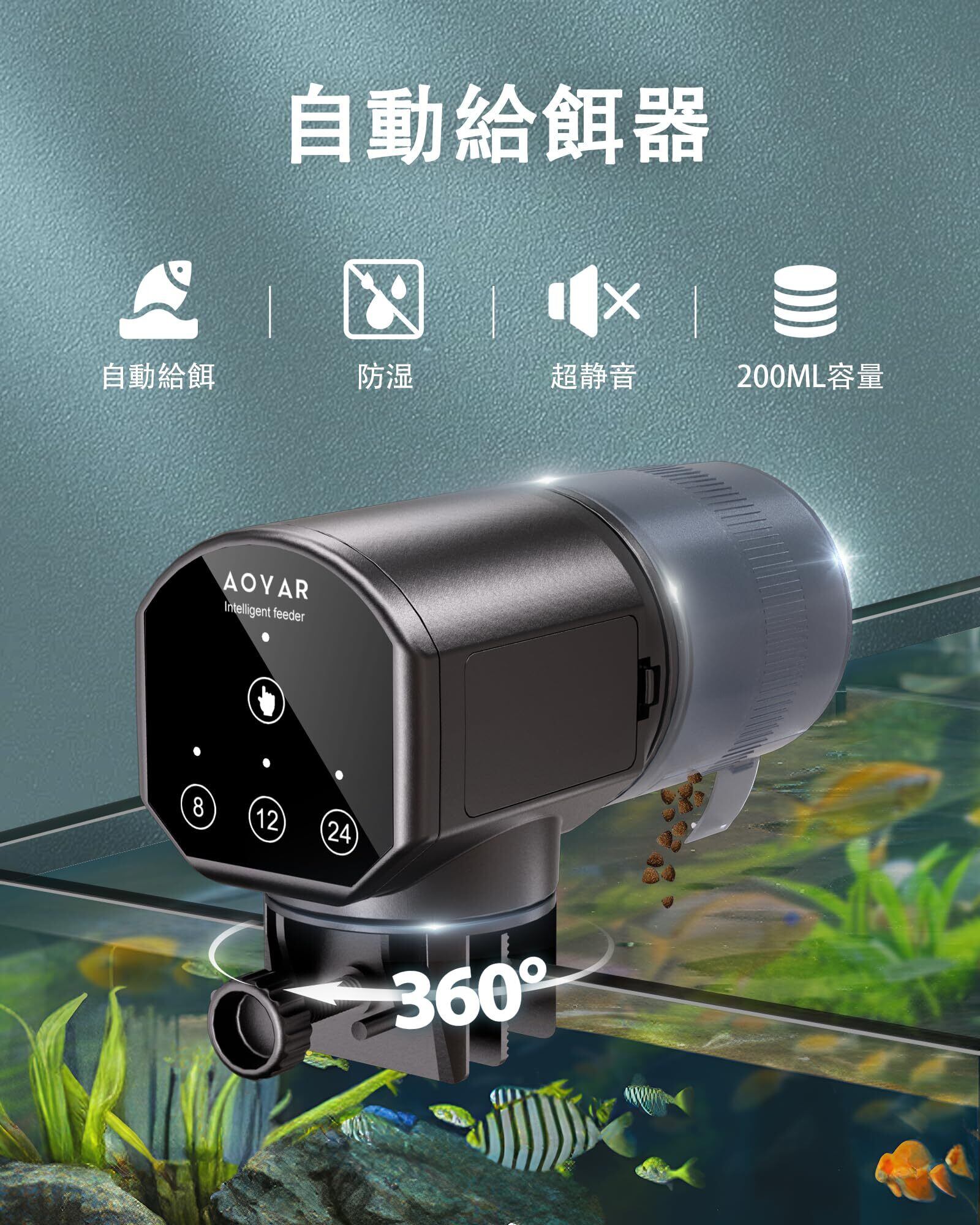 簡単設置&三種類の自動給餌モード:Aoyar魚自動給餌器には3つの給餌モードがあります。設定ページにある「8時間/12時間/24時間」三種類のボタンを選んで押すだけで、8時間/12時間/24時間ごとに給餌ができます。(手動で給餌することもできます)設定させた時間に魚に餌をあげられて、自由自在に旅行や外出することができます。 (小型魚には24時間に1回の給餌することをすすめします)