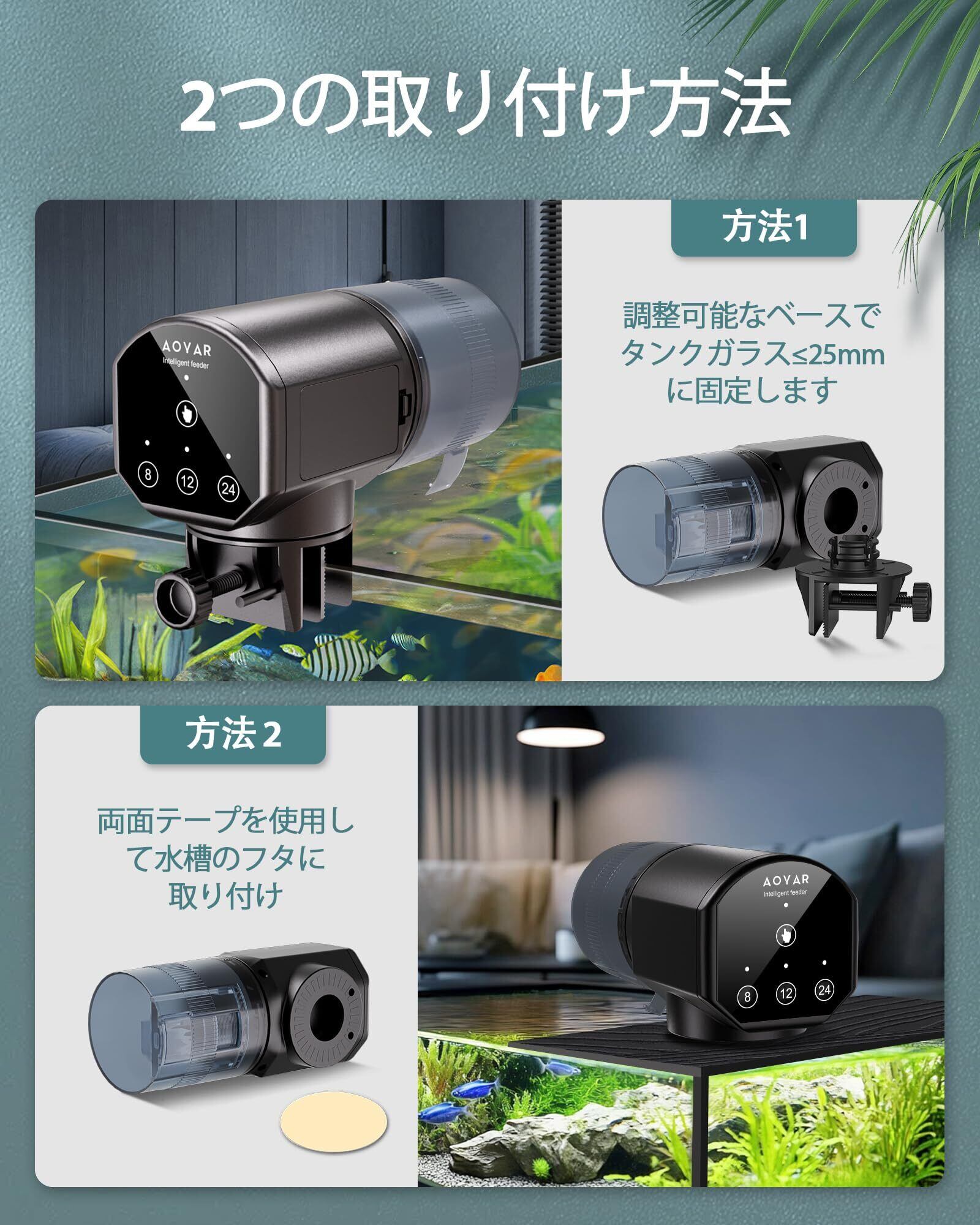 2つの設置方法: 当社の自動給餌器はあらゆるな水槽に適合します。 調整可能なクランプベースを介して厚さ0〜1インチの水槽のカバーに固定するか、特別に設計された両面ステッカーを使用して魚の餌箱を水槽のカバーに固定することもできます。 360°回転するデザインによって、自動給餌器を完璧な位置に調整することができます。