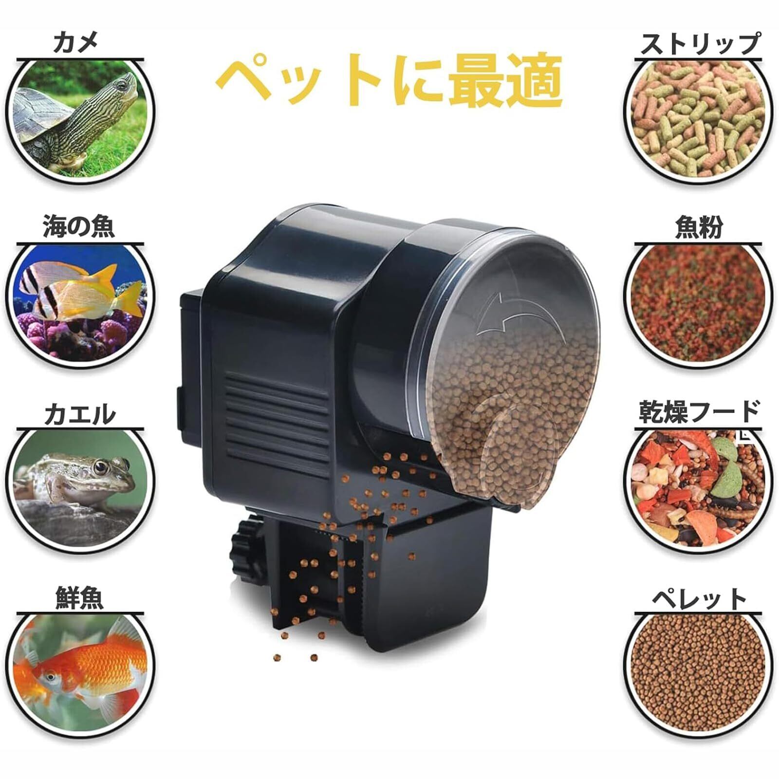 【餌の種類選択】オートフィーダーはドライフード専用です。 ペレット飼料、粒状飼料、ストリップ飼料、フレーク飼料に最適です。 本製品を水槽の上に置き、餌の湿気を避けてください。 その後、水槽カバーを固定し、穴を1つだけ空けてください。 穴に水草を入れ、餌を垂らすと、魚が餌を食べに来ます。