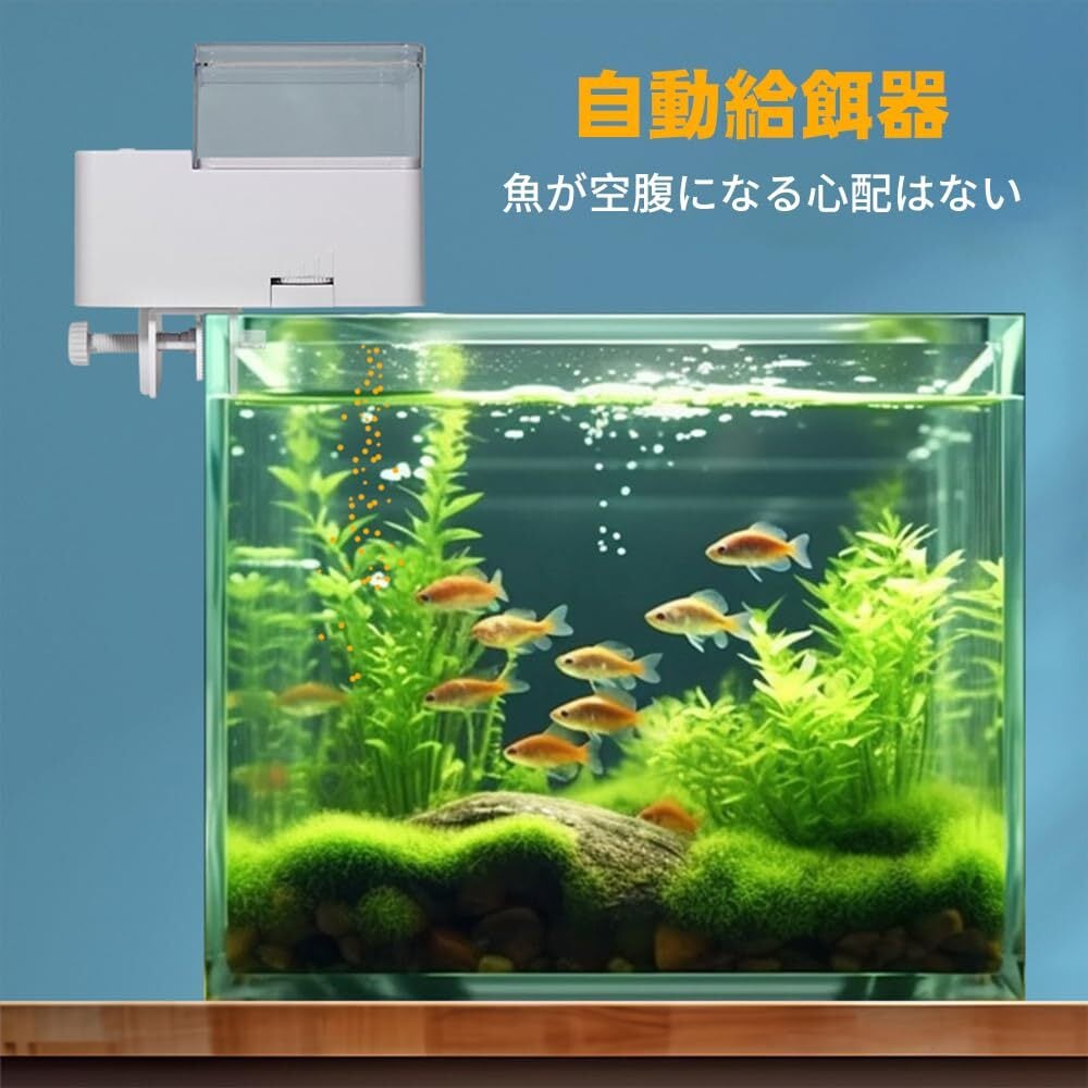 【使用シーン】1.長期旅行や外出時:長期間家を空ける際や忙しい日々に、魚の餌やりを心配することなく、定時で自動的に給餌してくれます。2. 家庭やオフィス:静音設計で家庭やオフィスなどの静かな環境でも気にせず使用できます。3.魚の初心者や忙しい方:手動で餌やりする時間がない方や、魚の飼育初心者にも簡単に使用でき、手間を省いて管理できます。