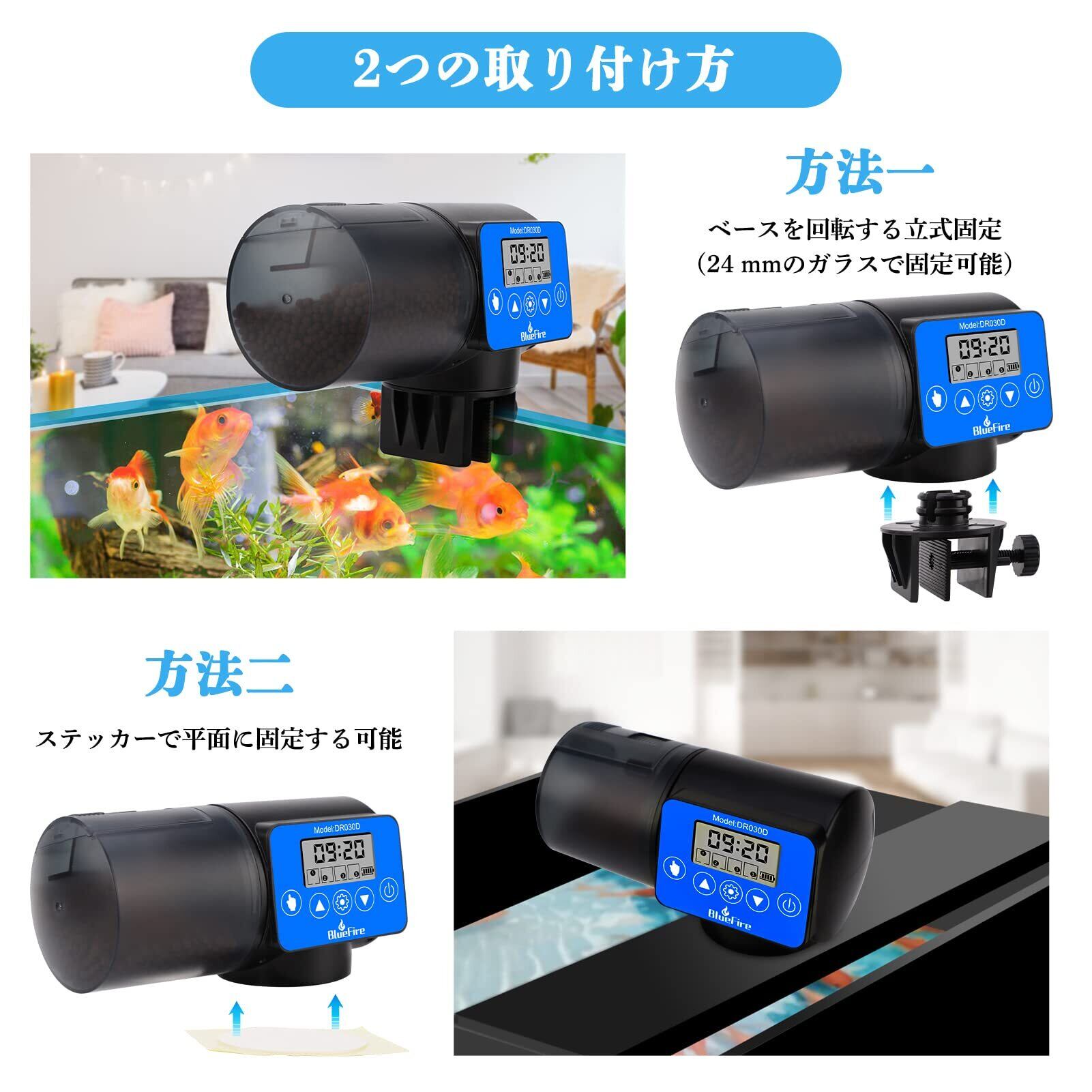 2つの取り付け方:水槽の様式によって、自動餌やり機の取り付け方が2つあります。水槽のフチにクランプで固定すれば簡単に設置可能。あるいは固定シールで据え置けます。※注:水面の上は湿気があり、サケースの餌を乾いた状態に保つために、フィーダーが水位を超えていることを確認してください。常に、 餌ドームを清潔する必要がある。
