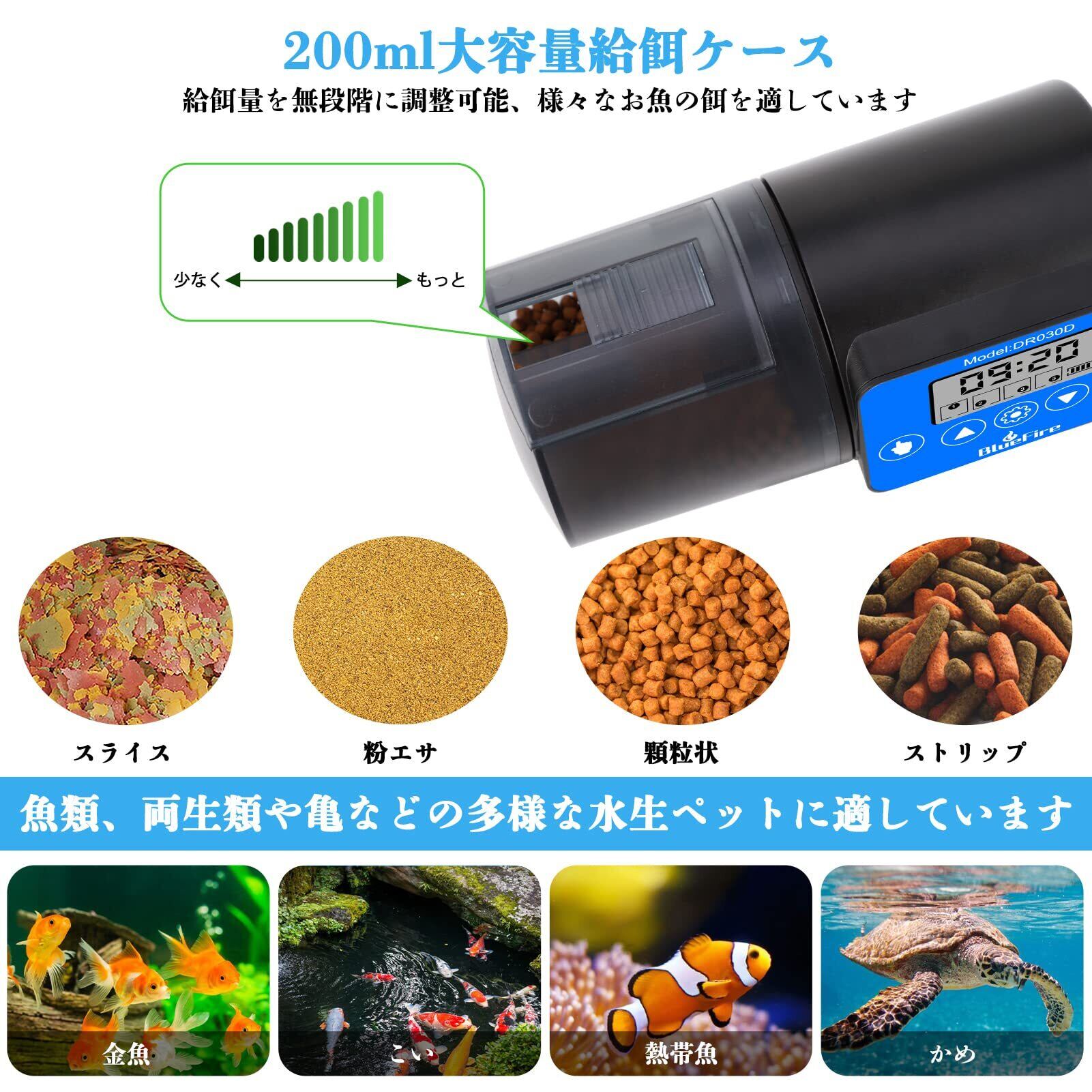 時間帯設定可能:この魚自動給餌器は毎日4つの時間帯が選択でき、餌の量も1-3回転で自由に設定できます。給餌時間の設定も自由に変更できます。餌種類ではエサケースはフレークタイプや顆粒タイプ、ストリップタイプ等のエサに適しています。乾燥な顆粒餌を向いて、給餌量は実際に合わせて魚やペットの数に応じて量を配分する調整可能。すべての設定が自由に変更できます。