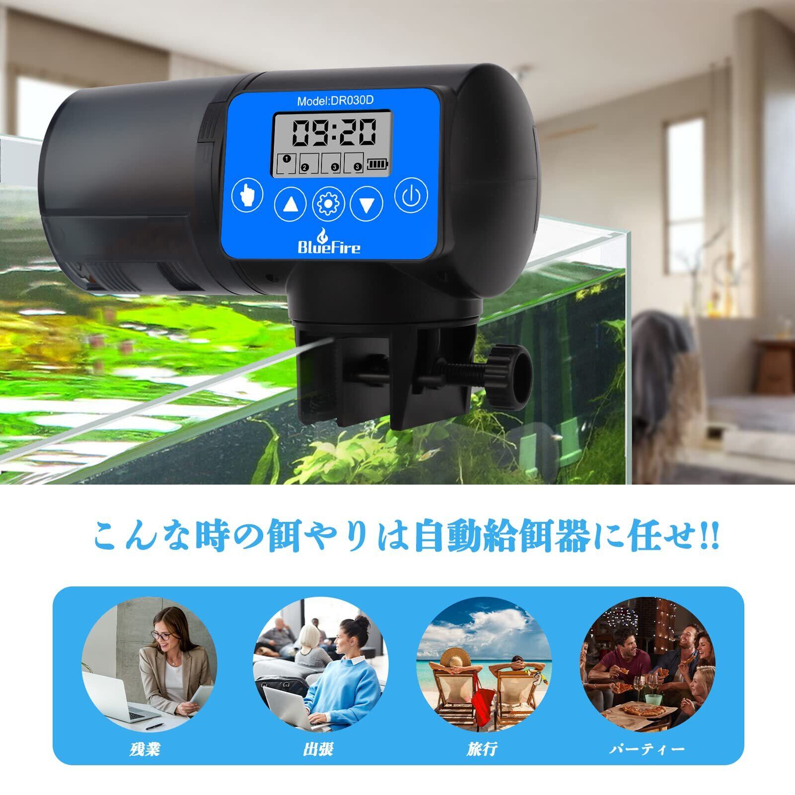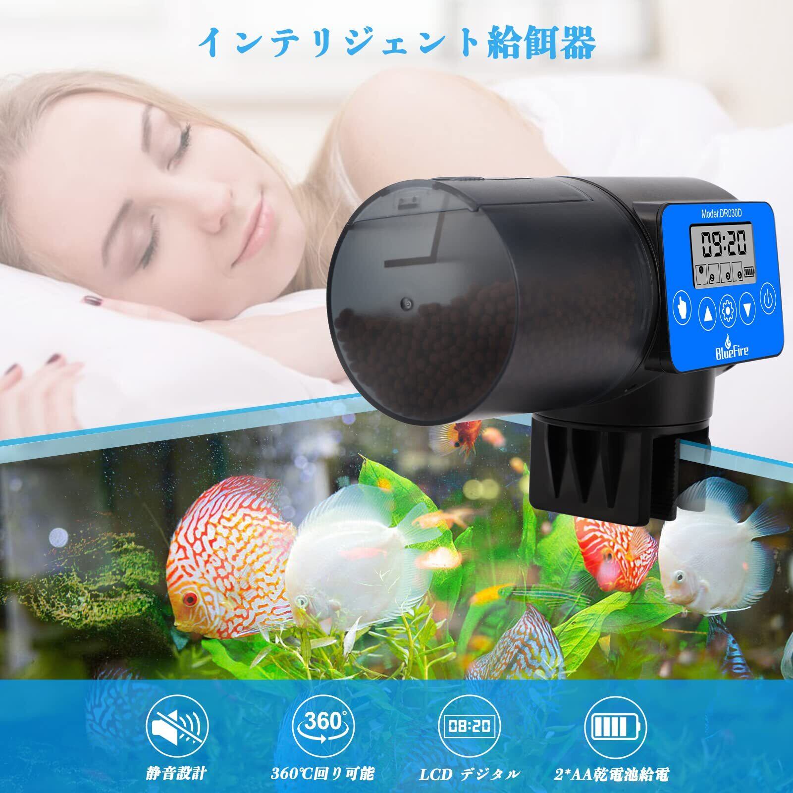 【数量限定】BlueFire 自動給餌器 魚 餌やり器 360°回転 定時 オートフィーダー 魚 熱帯魚 金魚 水族水槽用タイムフィーダー 静音 配給量調節可能 (ブルー)