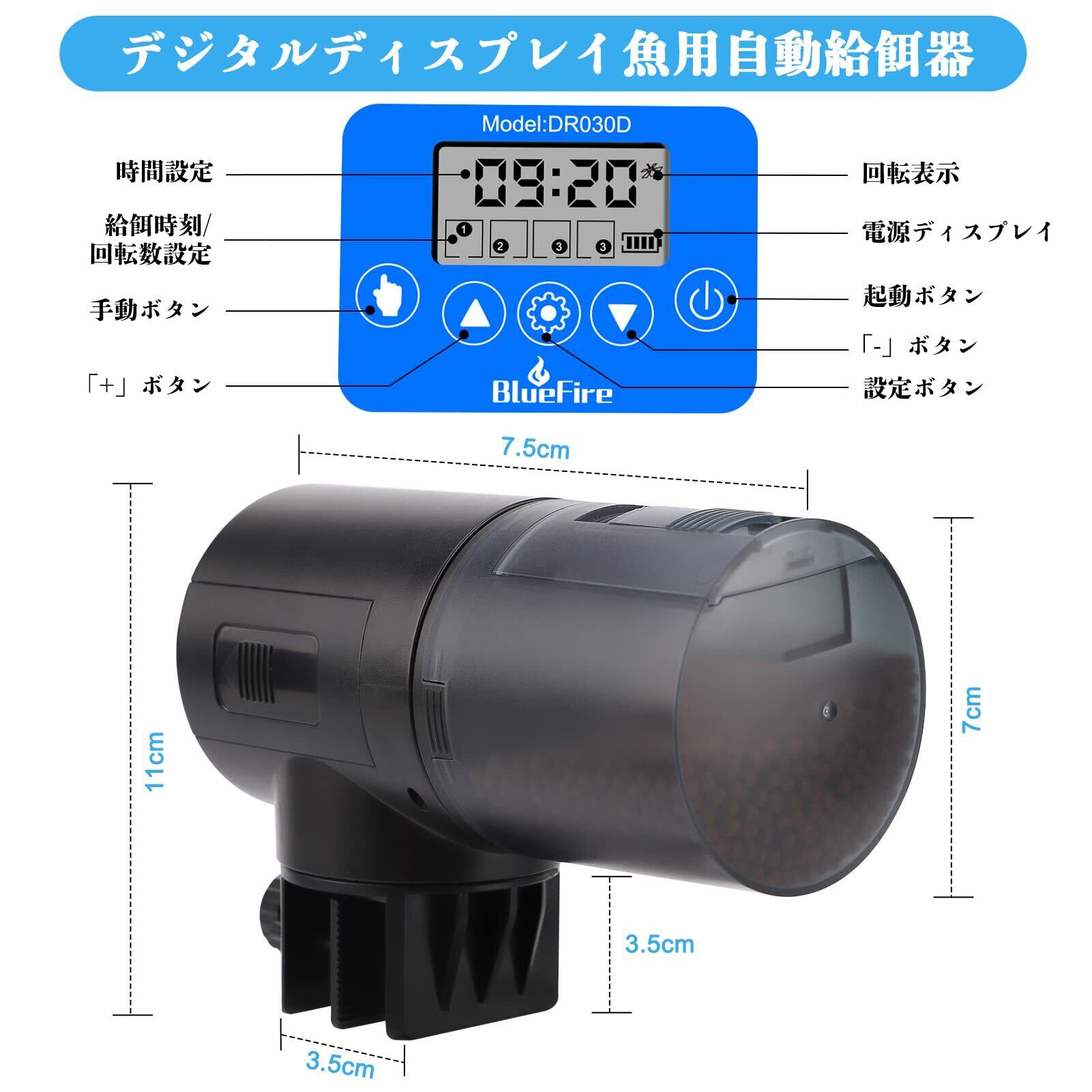 BlueFire 自動給餌器 魚 餌やり器 360°回転 定時 オートフィーダー 魚 熱帯魚 金魚 水族水槽用タイムフィーダー 静音 配給量調節可能 (ブルー)