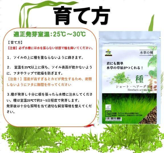 商品名:君にも簡単水草の草原がつくれる(ショート・ヘアーグラス) 水草の種類:ショート・ヘアーグラス 内容量:5グラム(60㎝水槽約1本分) 適正発芽【室温】:25℃~30℃です(※室温25℃を下回ると発芽率が低下します) 適正育成【水温】:25℃~28℃です(水温が低いと成長が鈍ります。水温が高いと葉が白くなり枯れ始めます) 【 育て方】 1.ソイルを3㎝~5㎝の厚さに敷き、種を蒔く前に霧吹きでソイル全体を湿らせます。 【注意!】蒔く際は種が重ならないように蒔きます。 2.25℃以上の気温で、ソイルの表面が乾かないように保ちます。 【注意!】適正室温以下だと発芽率が大きく低下します。室温、ソイル表面の乾燥に注意。ラップをかけるのをお勧めいたします。湿度が高すぎるとカビが発生する場合がございます。 3.種は室温25℃で約3~5日程度で芽が出始めます。発芽後は十分な照明を当て適切な飼育環境を整えてください。 【注意!】注水する場合は十分に根付いてから水張りを行ってください。 4.種は常温で未開封に限り約1年の保管が可能です。開封後は出来るだけ早めにご使用ください。 5,水草の育成に二酸化炭素co2の添加は不要ですが、添加を行うと水草の成長が促進されます。