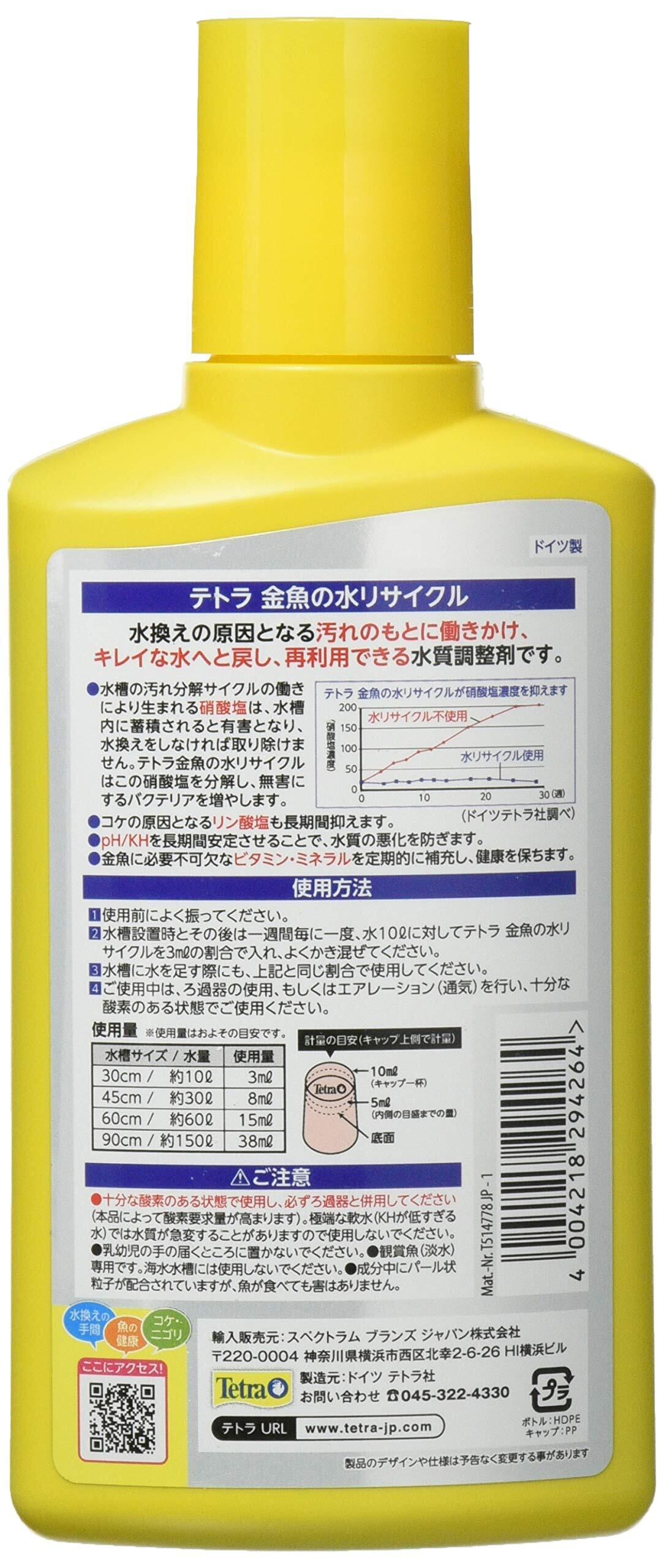 水換えの原因となる汚れのもとに働きかけ、きれいな水へと戻し、再利用できる水質調整剤。○水槽の汚れ分解サイクルの働きにより生まれる硝酸塩は、水槽内に蓄積されると有害となり、水換えをしなければ取り除けません。テトラ 金魚の水リサイクルはこの硝酸塩を分解し、無害にするバクテリアを増やします。○コケの原因となるリン酸塩も長期間抑えます。○ph/KHを長期間安定させることで、水質の悪化を防ぎます。○魚に必要不可欠なビタミン・ミネラルを定期的に補充し、健康を保ちます。○淡水用