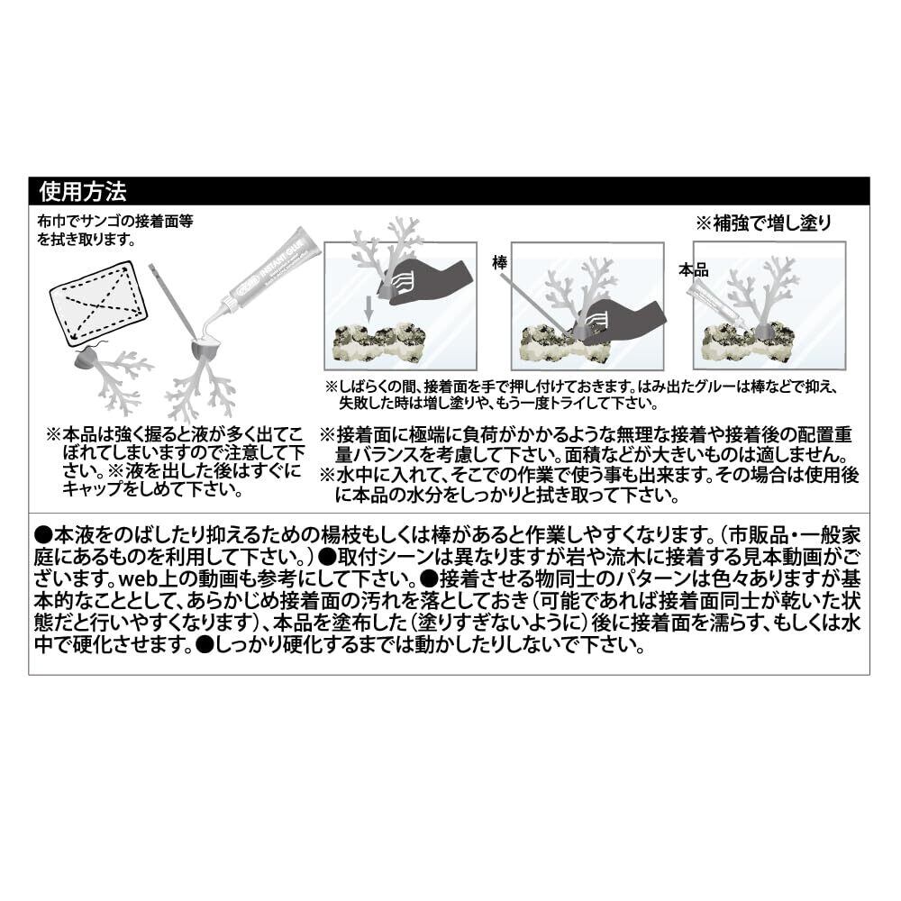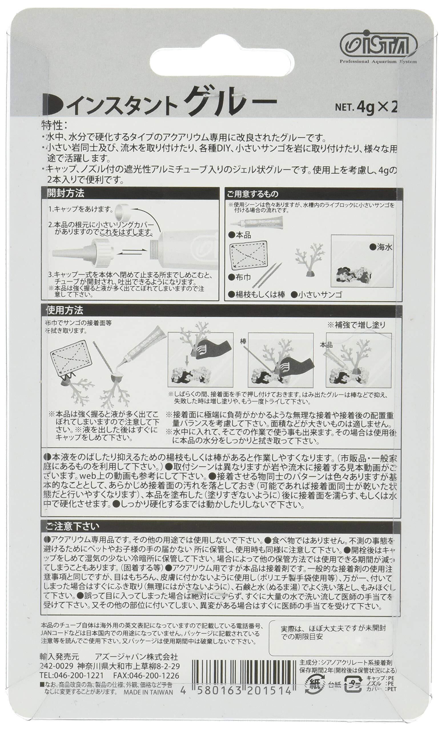 水中、水分で硬化するタイプのアクアリウム専用に改良されたグルーです。キャップ、ノズル付の遮光性アルミチューブ入りのジェル状グルーです。使用上を考慮し、4gの2本入りで便利です。