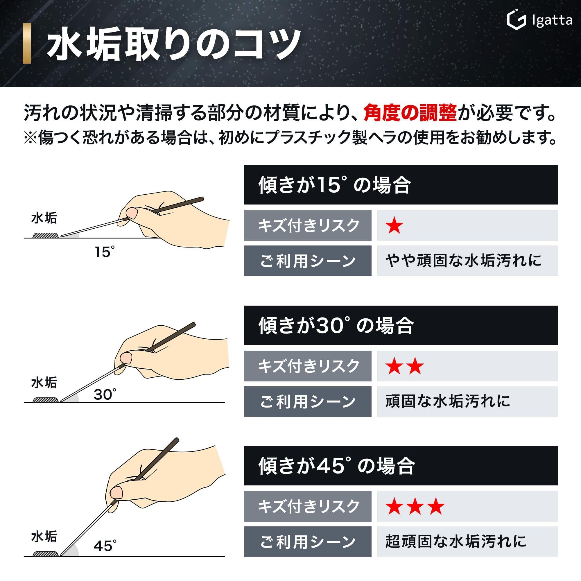【水垢取りのコツ】汚れの状況や清掃する部分の材質により、角度の調整が必要です。《傾きが15°の場合》キズ付きリスク小。やや頑固な水垢汚れに。《傾きが30°の場合》キズ付きリスク中。頑固な水垢汚れに。《傾きが45°の場合》キズ付きリスク大。超頑固な水垢汚れに。