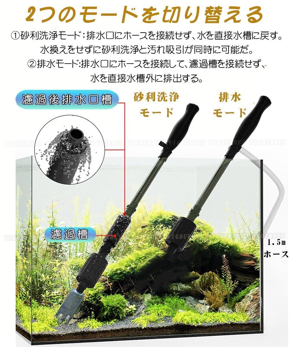 【パワーアップした吸引性能&水浄化機能】5V低電圧モーターで最大流量800L/hの強力吸引が可能です。800L/Hの大流量で、水槽の隅々までしっかり清掃。専用アタッチメントで壁面の汚れも除去可能です。汚れフィルターを装着すれば砂洗いモード(汚水を濾過して水槽に戻す)、外せば直接排水モードで、様々な掃除ニーズに対応します。フィルター内部に濾過綿を内蔵し、ゴミを効果的にキャッチ。排水口で汚水と浄水を分離し、水換え頻度を減らします。
