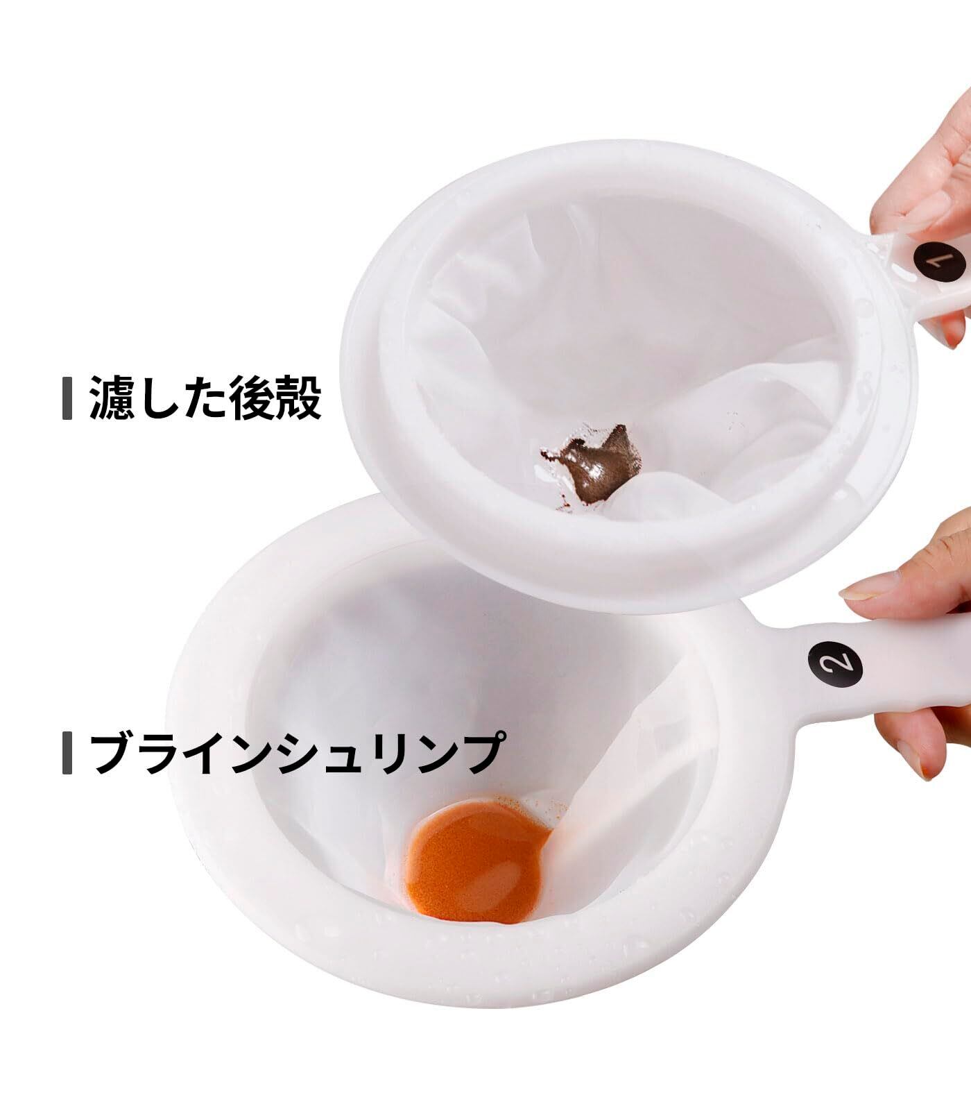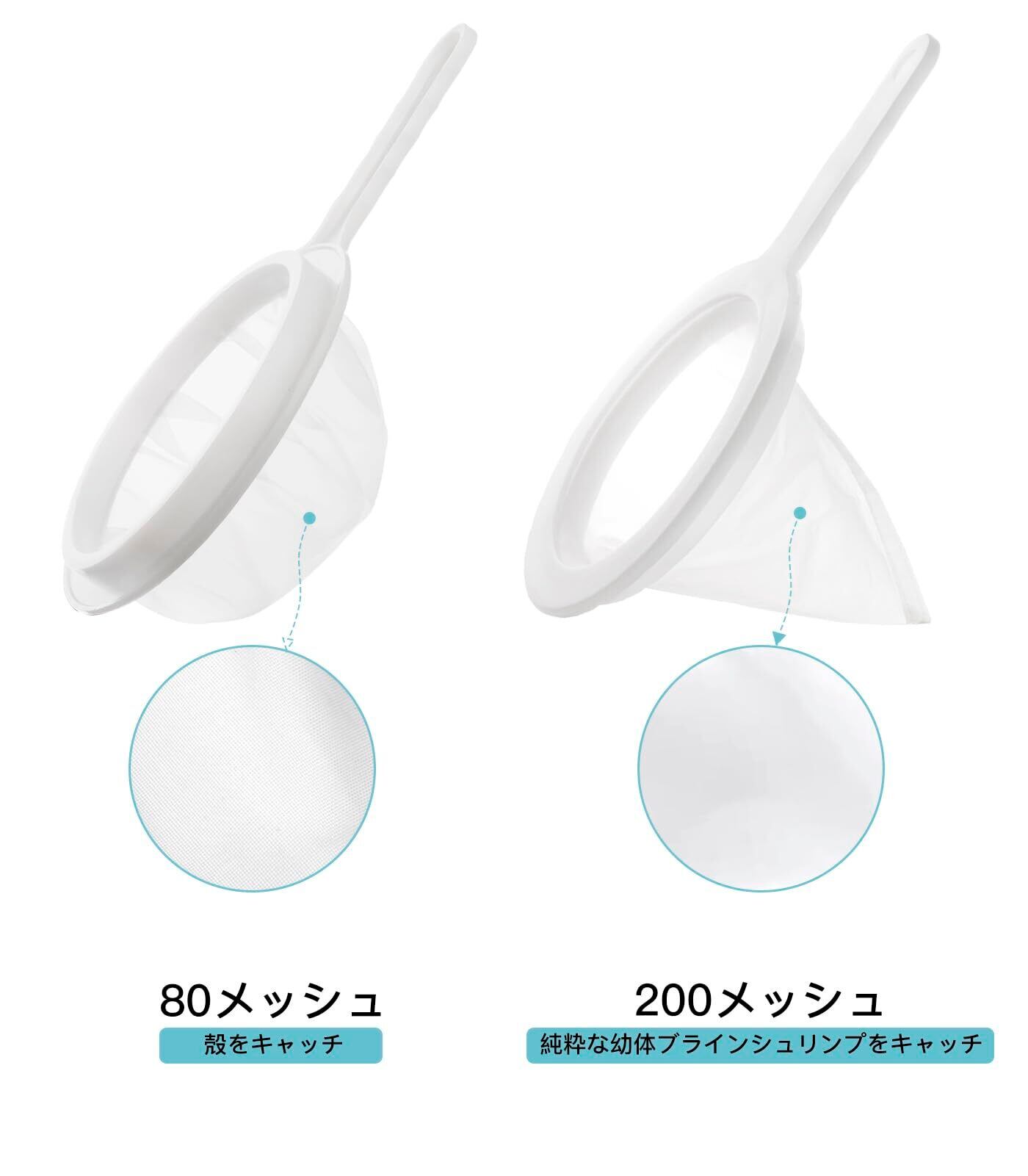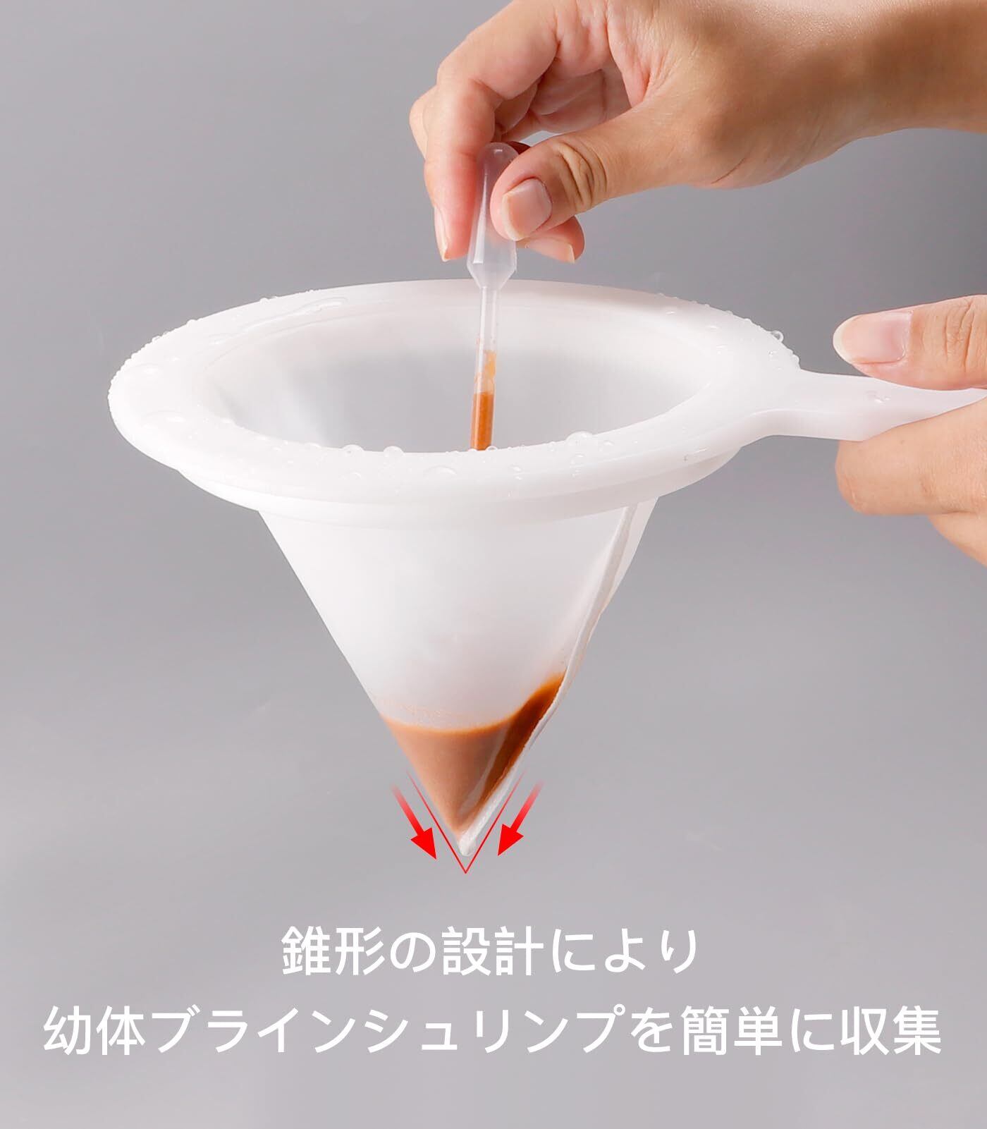 デザイン: 丸い粗い目のメッシュは塩水エビの殻を濾し、 円錐v型細かい目のメッシュは塩水エビを集めやすくになります。