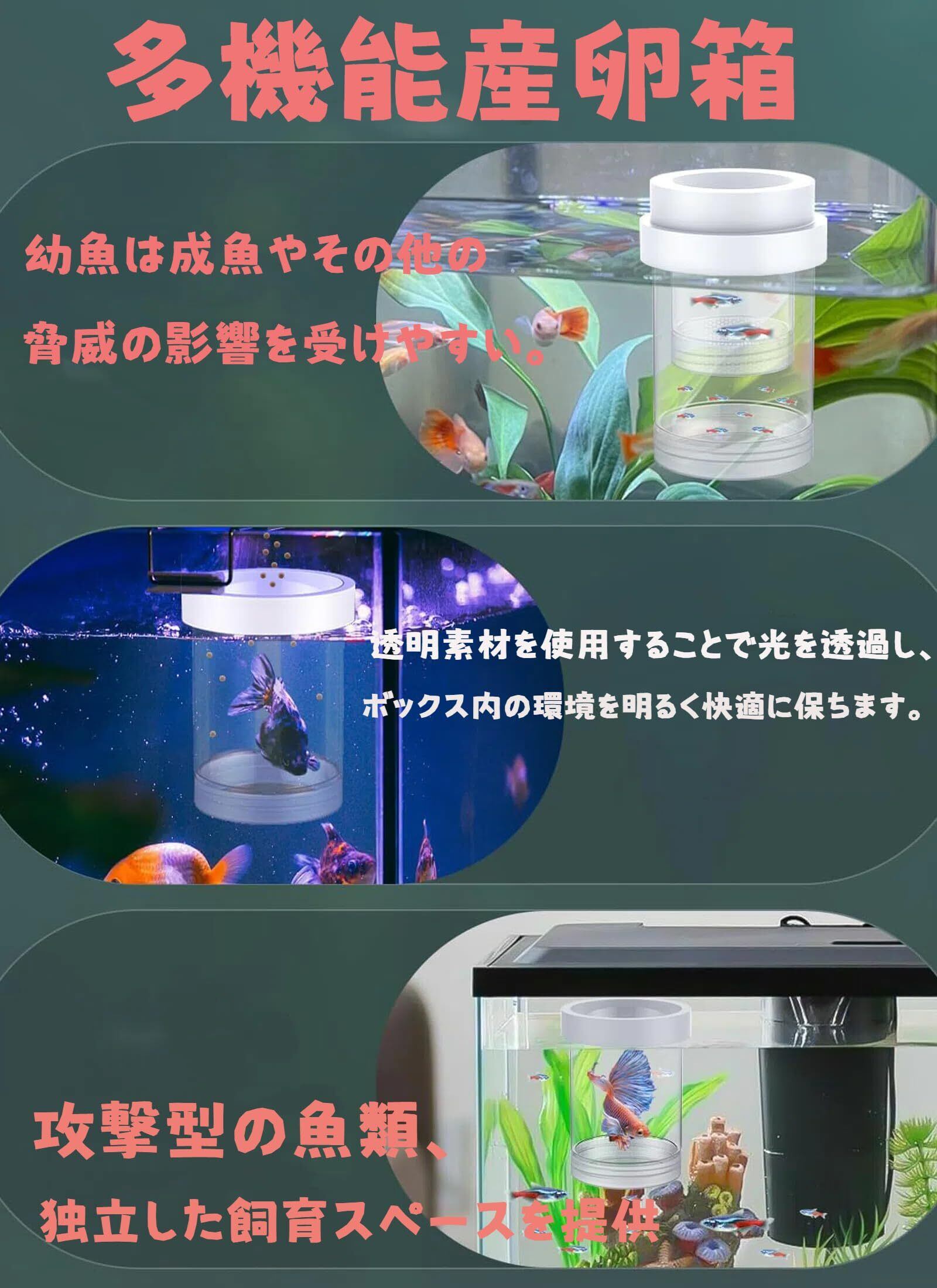 透明飼育ボックス:透明なデザインを採用しており、幼魚の安全を確保しながらボックス内で何が起こっているかを見ることができます。これにより、稚魚の成長と健康状態を簡単に監視できます。透明素材を使用することで光を透過し、ボックス内の環境を明るく快適に保ちます。