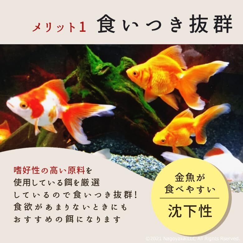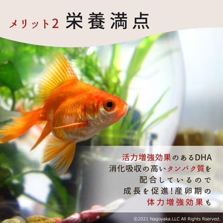 【効果】魚の繁殖をされているプロや愛好家たちに使われている 高栄養魚飼料となります。魚の 食いつきの良さと産卵の多さを実感できます。【この飼料の特徴】 ・ 沈降性で水底の餌を好む金魚をはじめとした魚に向いています。・高蛋白の 栄養価が高い飼料です。 ・ 消化吸収の高い蛋白質が豊富・ 活力増強させるDHA、りん脂質が豊富・魚の 食いつきの良さと産卵の多さを期待できます。・魚が 丈夫で健康的に育つことが期待できます。