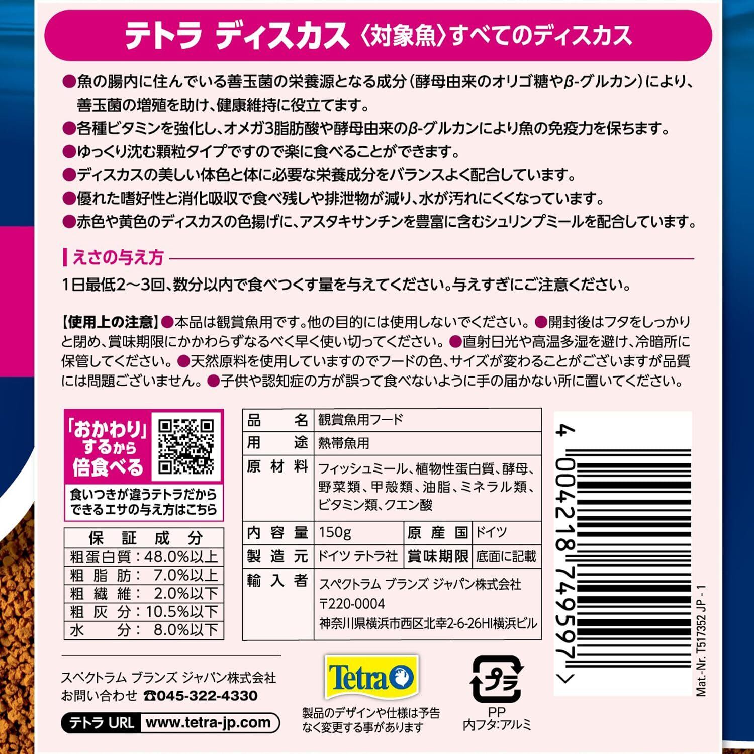 テトラ(Tetra) ディスカス 150G 熱帯魚の餌 善玉菌の増殖を助けて 糞を分解 ニオイも汚れも抑えるフード 天然原料のみ使用の安心フード 着色料 保存料 不使用 水をキレイに保つ 食いつき特化 おかわり給餌
