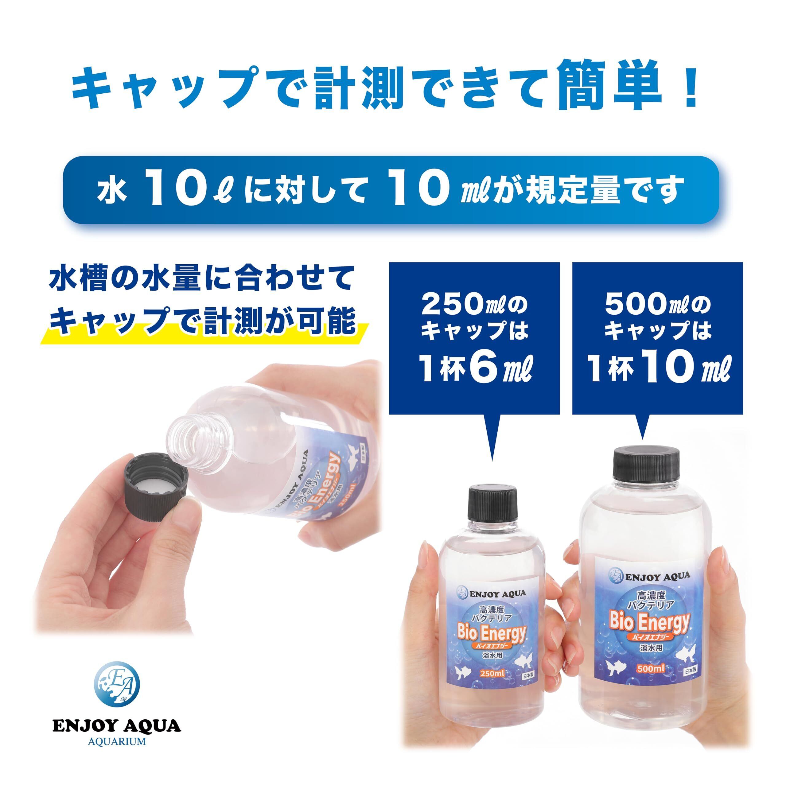 ENJOY AQUA 高濃度バクテリア バイオエナジーを適度に水槽内に投入することで生物ろ過を促進し、水質を整え、魚の健康を長く維持し、飼育水をすばやく安定させ、ニオイのない輝く澄んだ水をつくります。