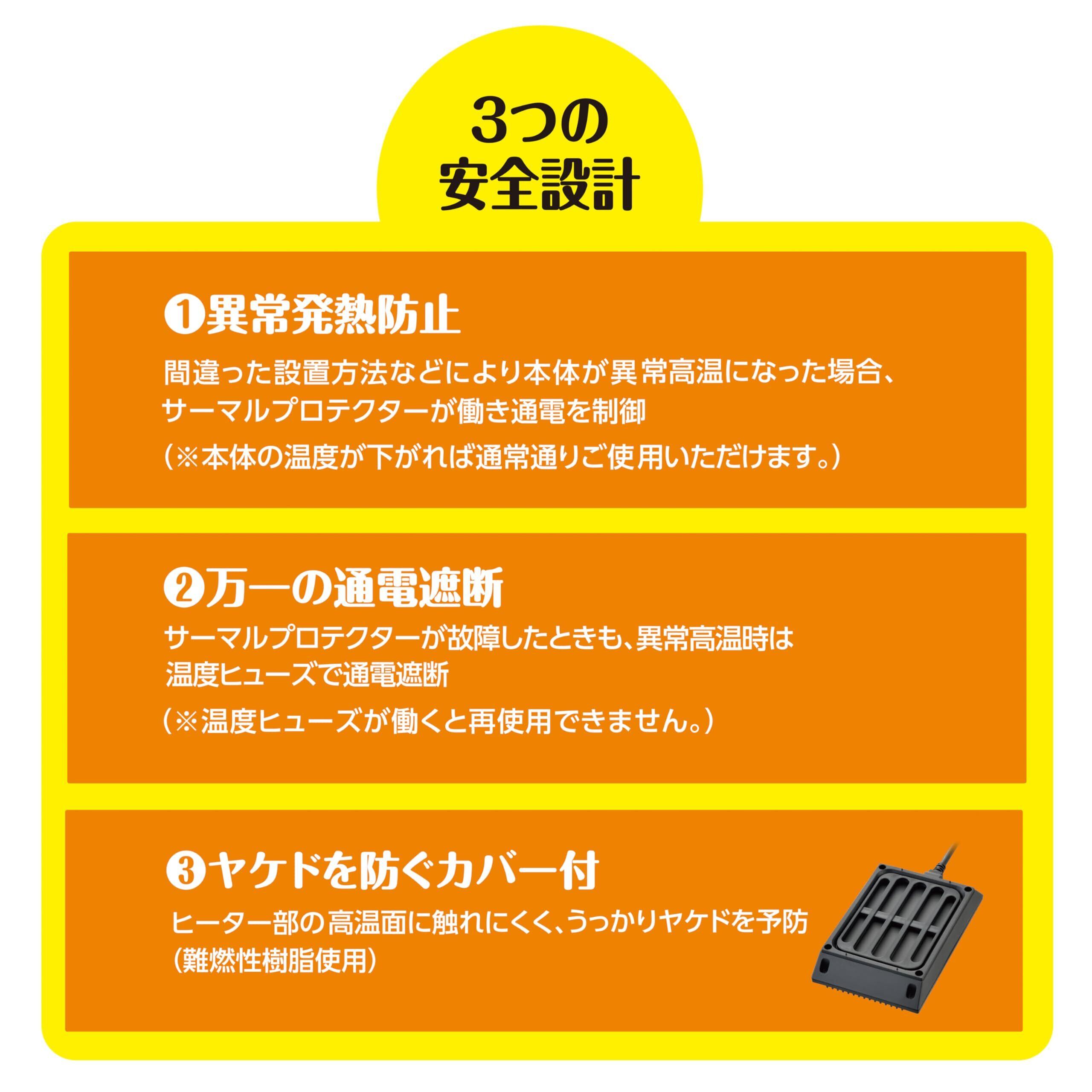 ・ケージの上に置くだけ! 簡単設置の薄型ヒーター。ケージ内部に熱を伝え、空気を優しくあたためます。 ・光を出さないので、夜間や夜行性生体の保温にも最適。 ・ケージ外に設置するので、レイアウトを自由に楽しめるだけでなく、生体・飼育者のヤケドも予防します。 ・低消費電力で省エネ。 【3つの安全設計】 (1)誤使用による発熱防止 間違った設置方法等により本体が異常高温になった場合、サーマルプロテクターが働き通電を制御。 (2)万一の通電遮断 サーマルプロテクターが故障した時も、異常高温時は温度ヒューズで通電遮断。(※温度ヒューズが働くと再使用できません) (3)難燃性樹脂カバーつき ヒーター部の高温面に触れにくく、うっかりヤケドを防止。