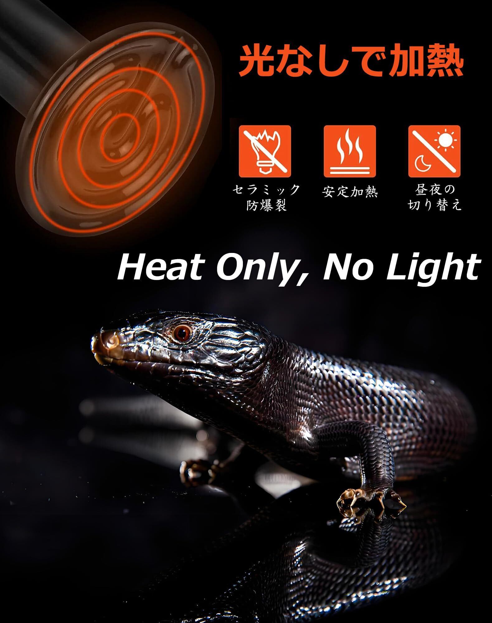 この爬虫類保温球はペットの血液循環を促進し、強化の健康、血管を拡張することができます。昼夜どちらでも使用でき、白熱電球のように光を出さないので爬虫類の生活サイクルを妨げず、夜間の光を嫌う爬虫類に最適な保温電球です。