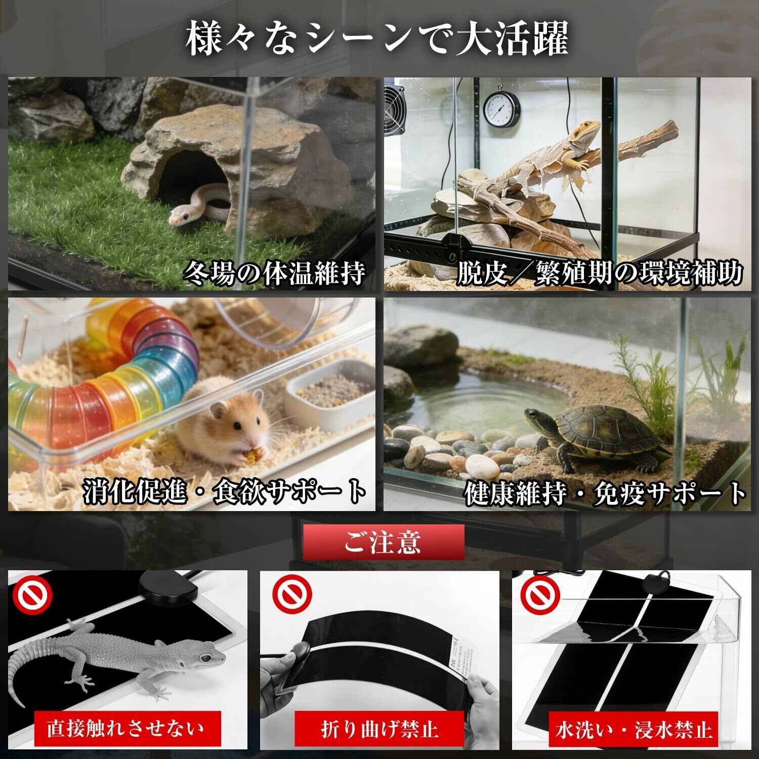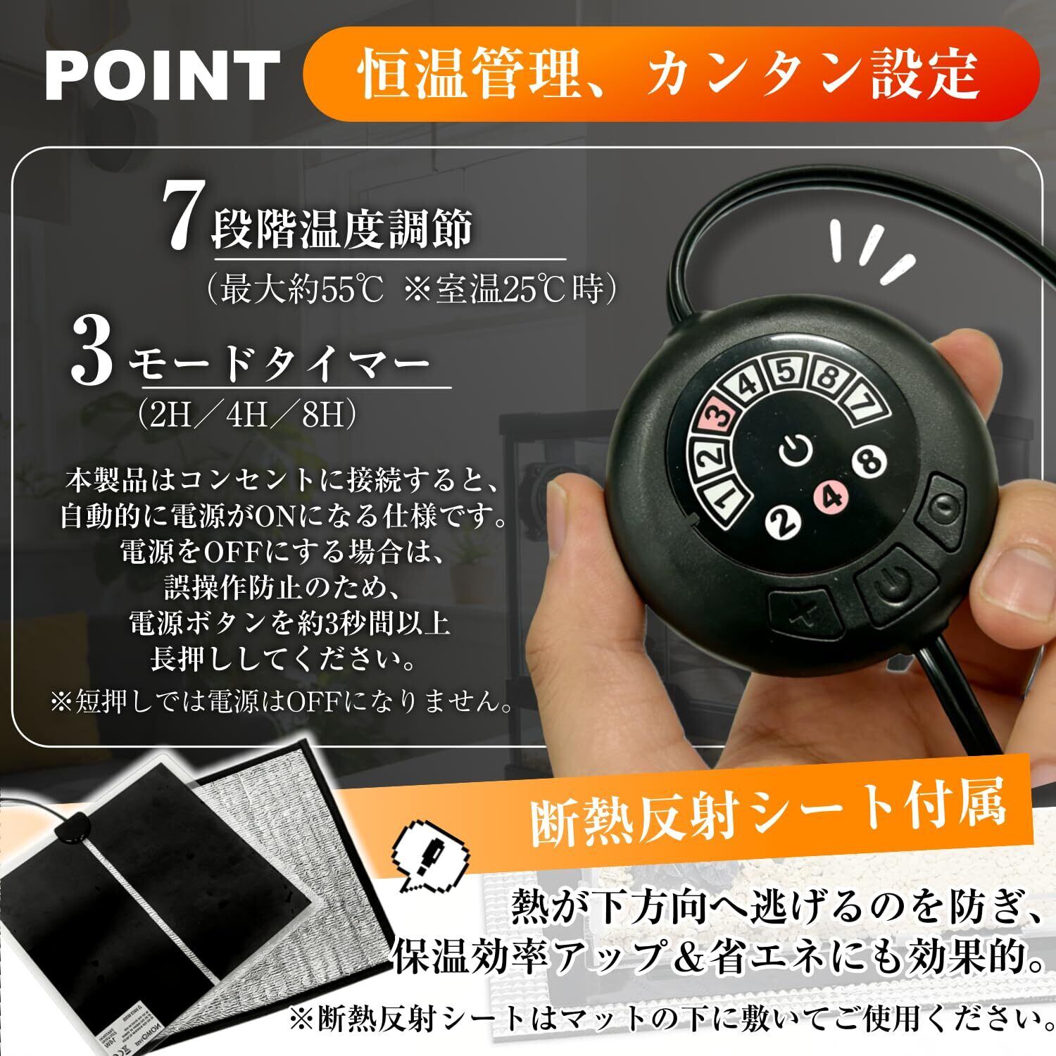 【7段階温度調節&冬眠対策に最適】この爬虫類ヒーターは7段階の細かな温度調整に対応し、室温+3〜25℃まで加温可能(室温25℃時、最大約50℃前後)。寒さ対策や低体温防止に役立ち、ハムスター・フェレット・ハリネズミ・うさぎ・モルモット・デグーなど幅広い小動物に使用できます。コンセントに接続すると自動で電源がONになる仕様で、操作も簡単。電源をOFFにする場合は誤操作防止のため電源ボタンを約3秒以上長押ししてください(※短押しではOFFになりません)。初心者の方でも安心して扱える設計です。