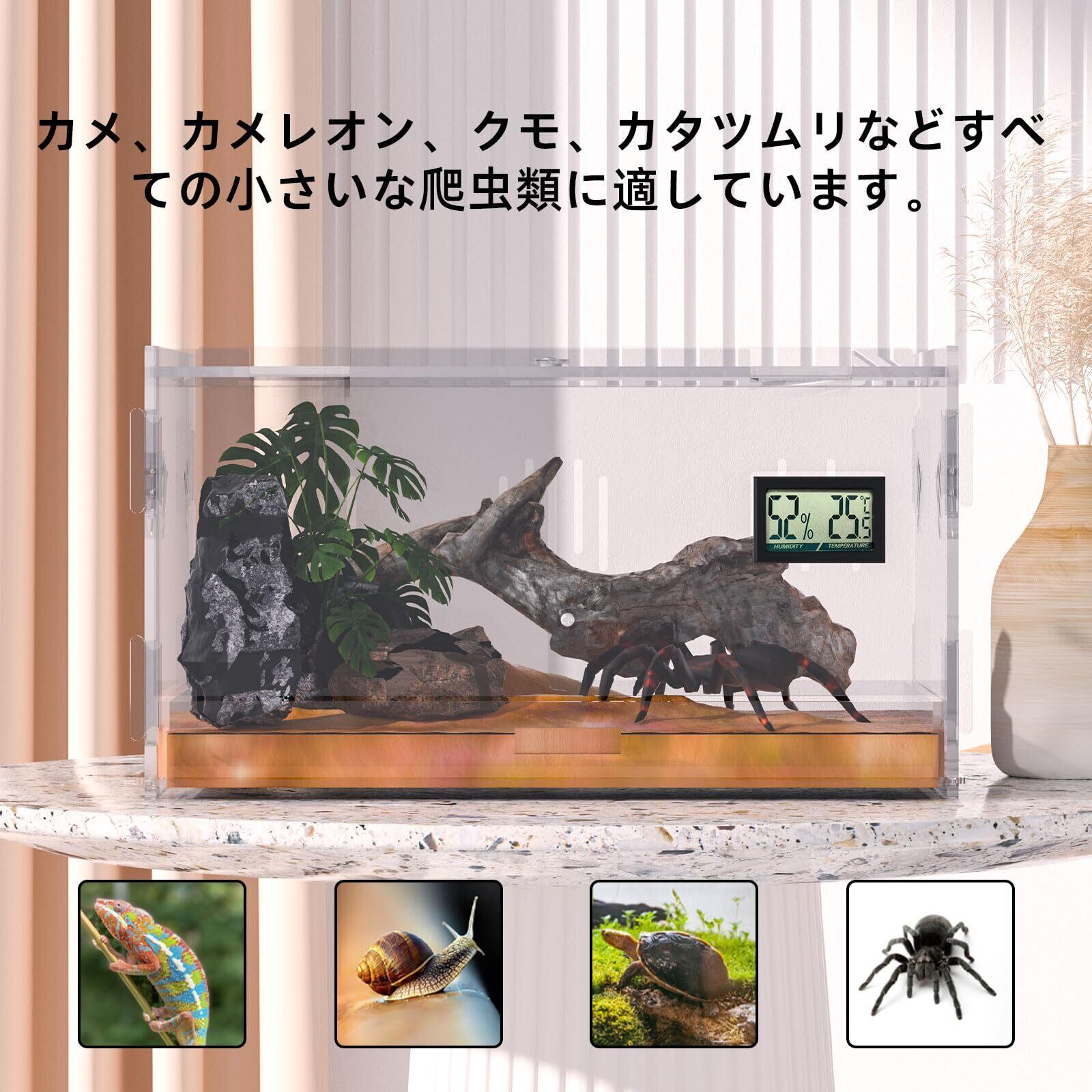 通気性が良い:左右と背面に複数の通気孔を設計し、空気循環のために、クモ、カメ、カエル、コーンスネーク、ハムスターなどの餌付けに適しています。