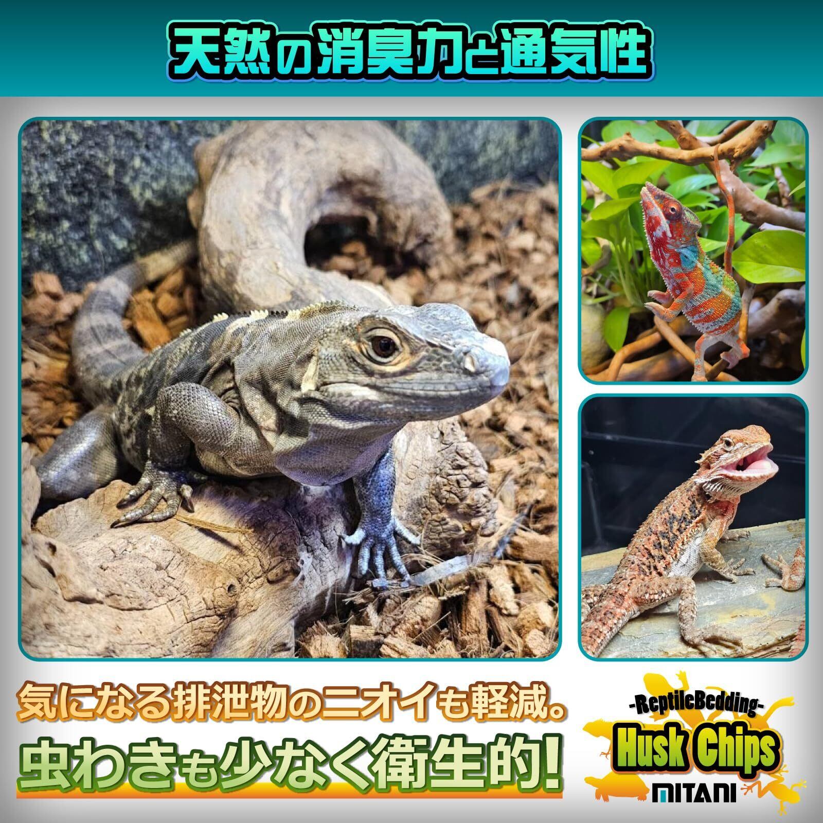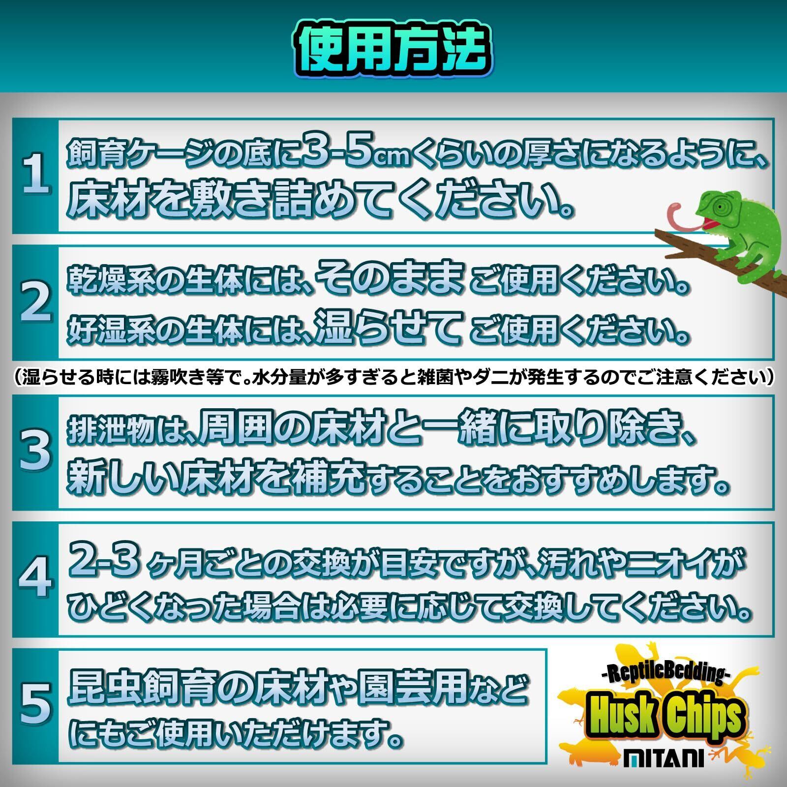 爬虫類用床材 ハスクチップ 【天然ヤシガラ100% 】ヤシの実の外皮(ヤシガラ)を水洗いしてアク抜きし、乾燥させた生体に優しい天然素材。 【天然の消臭力と通気性】天然の脱臭能力で排泄物の匂いも気にならならず、通気性があるため虫湧きや雑菌が少なく衛生的。 【生体の環境づくりに最適】乾燥させても湿らせても使用できるので、生体に合う棲息環境を再現できます。特に保水性が高いため、湿度を好む生体の飼育に最適。 【楽々メンテナンス】カットが粗目で細かくないため、粉が舞う事もなくメンテナンスや管理がしやすい素材。使用後は燃えるゴミとして捨てられます。 【内容量】10L (袋サイズ 45㎝ × 30㎝ × 8.5㎝) 【原産国】スリランカ 【メーカー】株式会社ミタニ