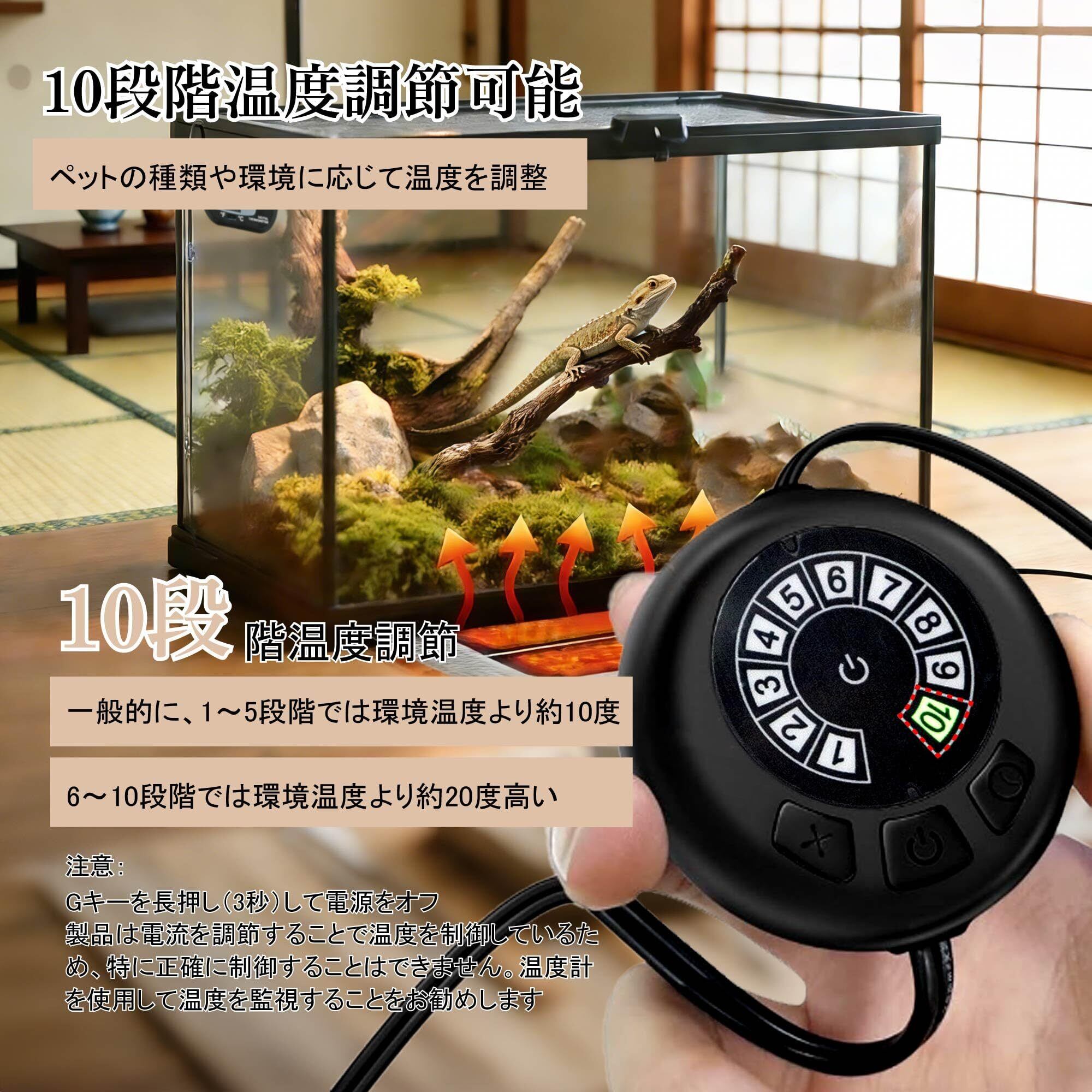 【10段階温度調節機能】段階式で温度(20~50℃)を自由に調整可能で、さまざまな環境に対応できます。加熱パッドは過熱保護機能も備えており、長期間安心して使用できます。注意:爬虫類や昆虫を直接マットの上に置かないでください。
