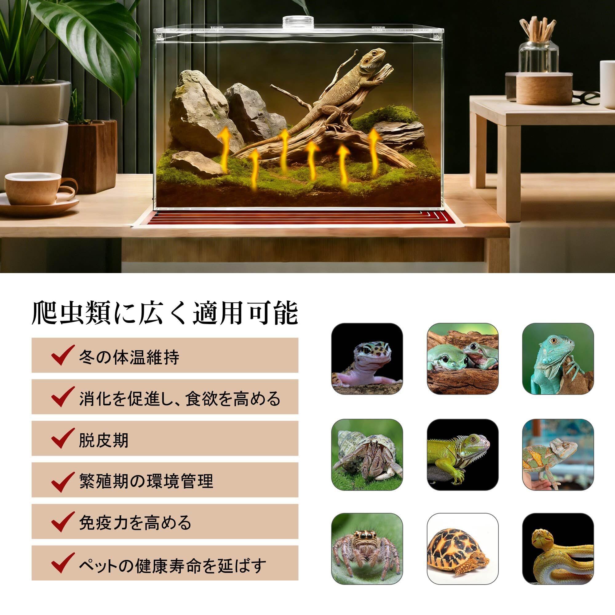 【適用対象が多い 】パネルヒーターは、爬虫類や両生動物に最適な環境を簡単に提供できます。トカゲ、カメレオン、ヤモリ、リクガメなどの小型ペットが寒い時期でも快適に過ごせるよう支援し、活動や食欲、新陳代謝を促進します。加熱パッドは、ガラスの飼育箱外部に設置し、2~3cmの垫材を底部に敷いてペットが厚さを調整できるようにすることをお勧めします。