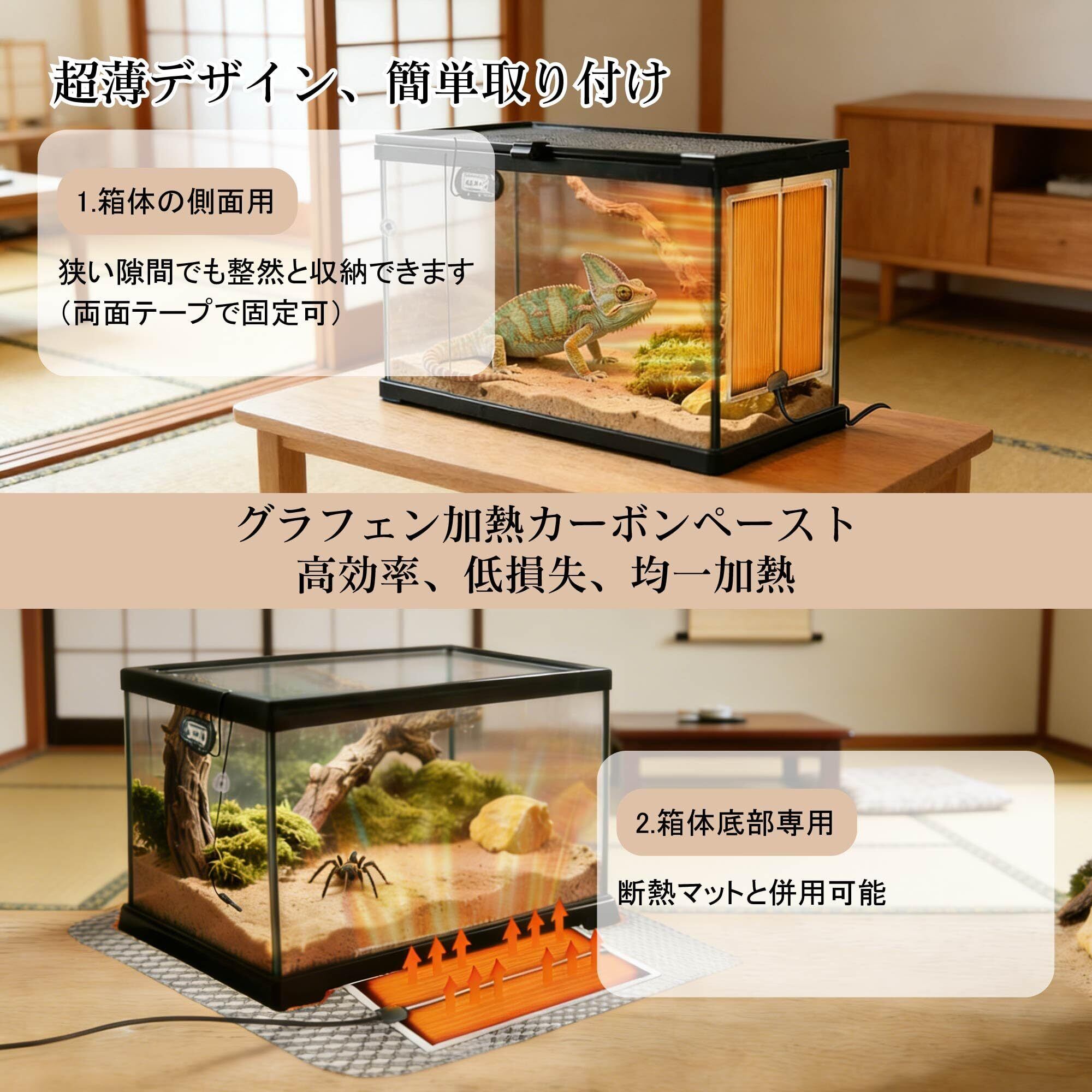 【簡単取り付け】それぞれの飼育環境に合わせて、テラリウムや動物飼育箱の底面や側面に簡単に取り付け可能です。加熱パッドは必ずガラス飼育箱の外部に設置してください。また、温度プローブは加熱パッドの最も近い位置に設定することを強くお勧めします。