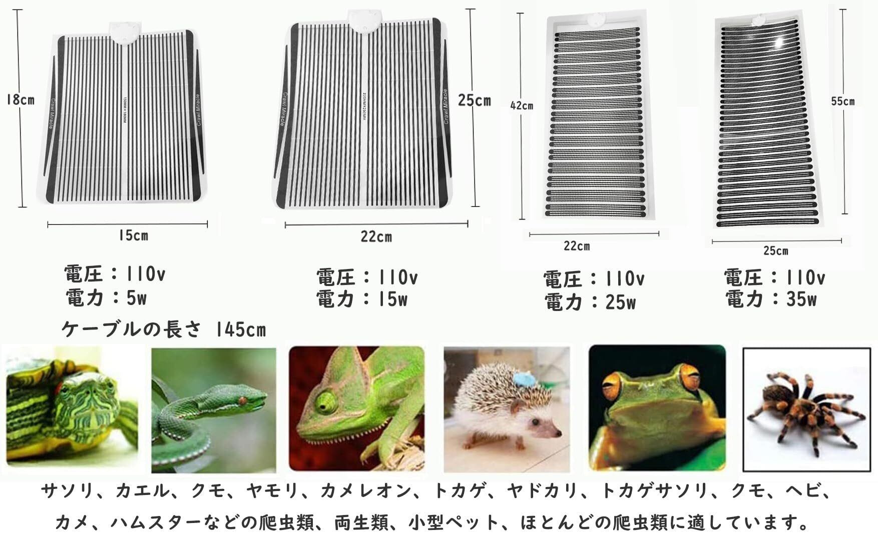 【110V米国標準プラグ/4つのサイズ】110V米国標準プラグと電圧タンクヒーターの下に、アダプタ不要、安全でバランスのとれた温度分布。この爬虫類用ヒートパッドは低電力でエネルギー効率が高い。 発泡スチロールの箱や発泡スチロールの板と組み合わせて使用すると加熱効果が上がります。 お客様のニーズに合わせて、様々な給餌ケージに対応できるよう4つのサイズをご用意しました:15*18、22*25、22*42、25*55。