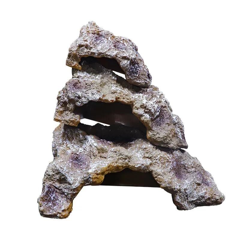 【省スペース形状】 - この水槽洞窟の角の一つは直角になっています。水槽の角度に合わせて繊細に設計されているため、省スペースです。ヘビの隠れ家ボックスやテラリウムの角にこの爬虫類用岩を置くと、より安定します。