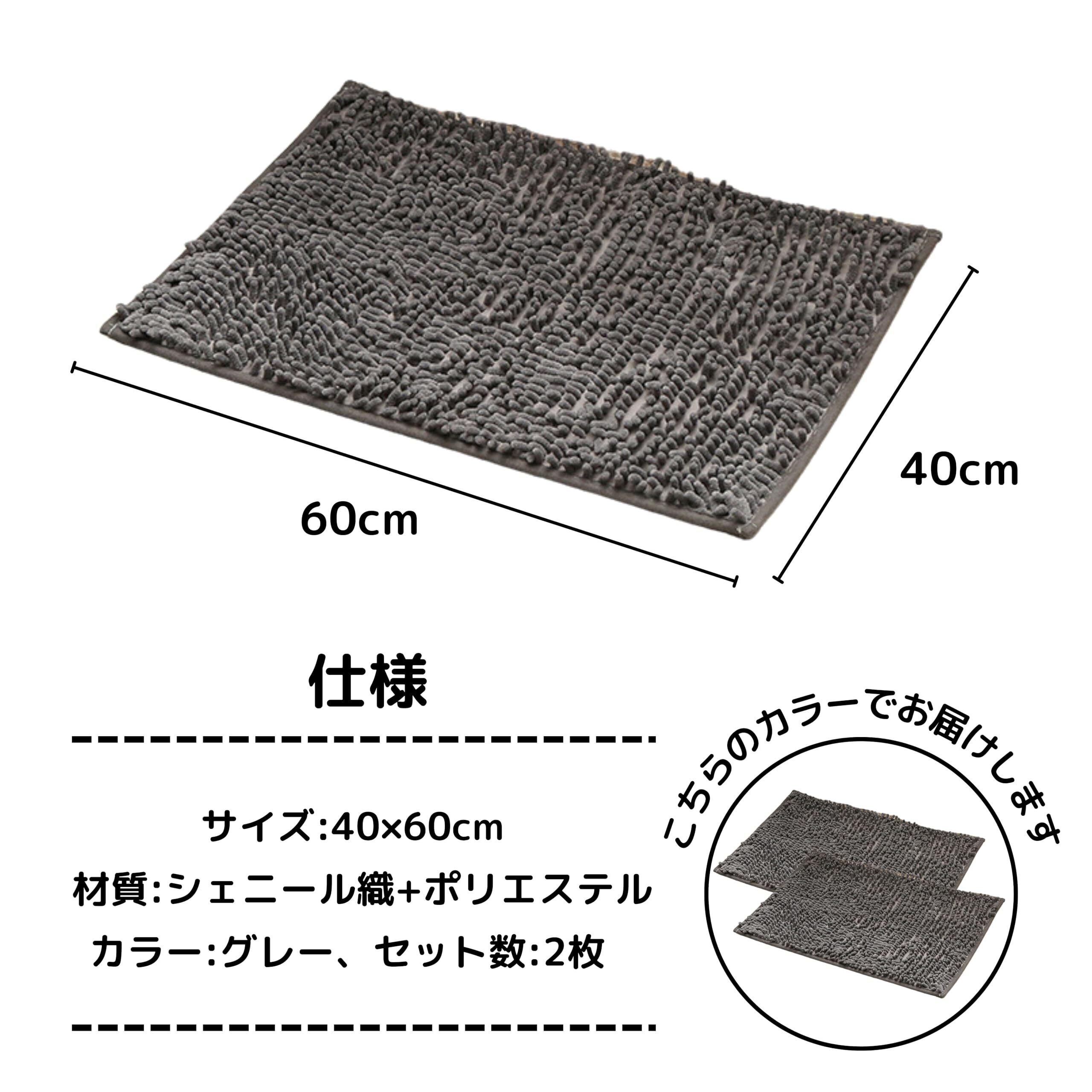 【仕様】サイズ:40×60cm、材質:シェニール織+ポリエステル、カラー:グレー、セット数:2枚