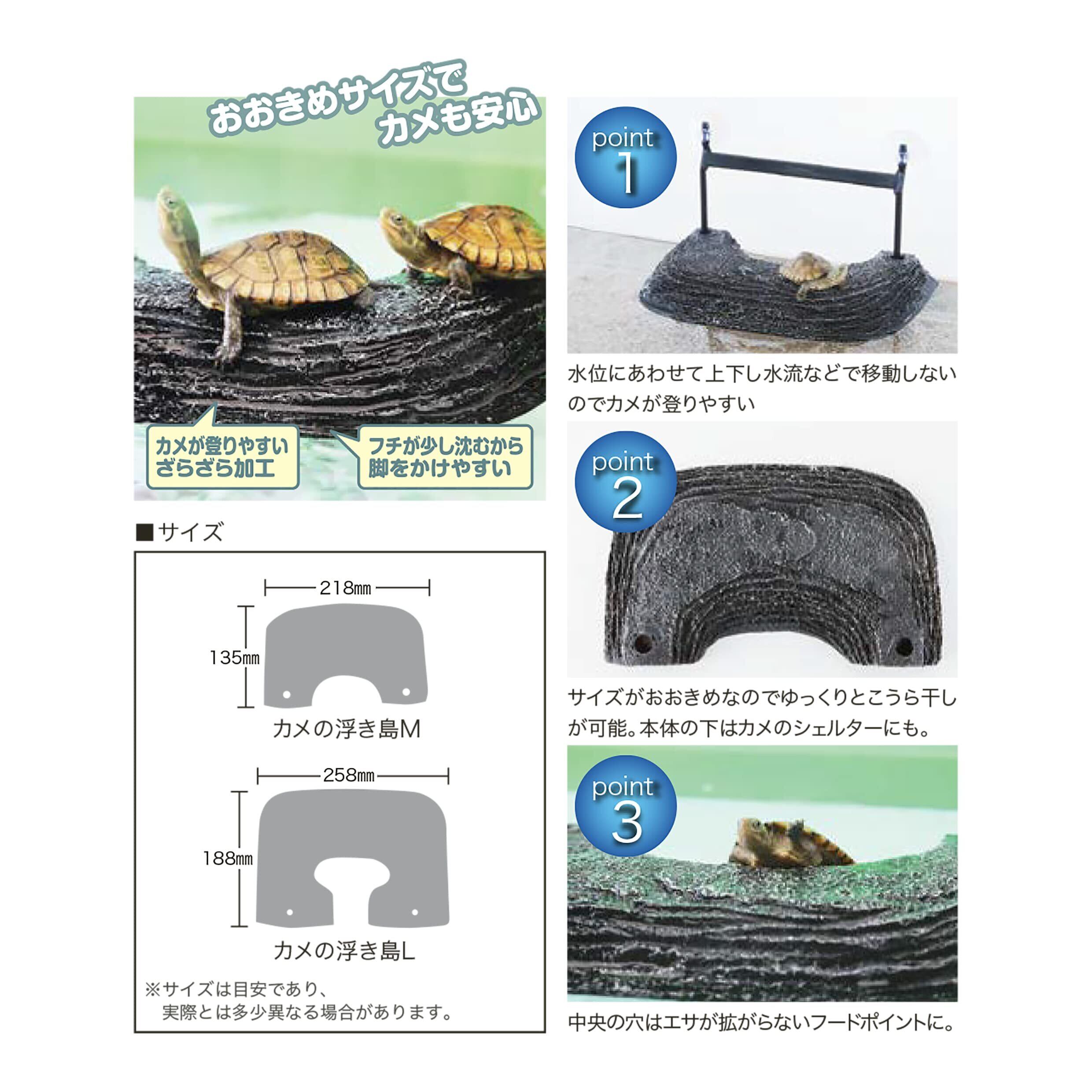 水棲のカメは陸地での甲ら干しが欠かせません。甲ら干しをすることによって皮ふ病の予防や成長に 欠かせないカルシウムの吸収を補助するビタミンD3 を合成します。本製品は水棲カメの生態を研究した独自の構造で日々のカメ飼育から新たな発見を引き出します。●本体サイズ:218×135mm