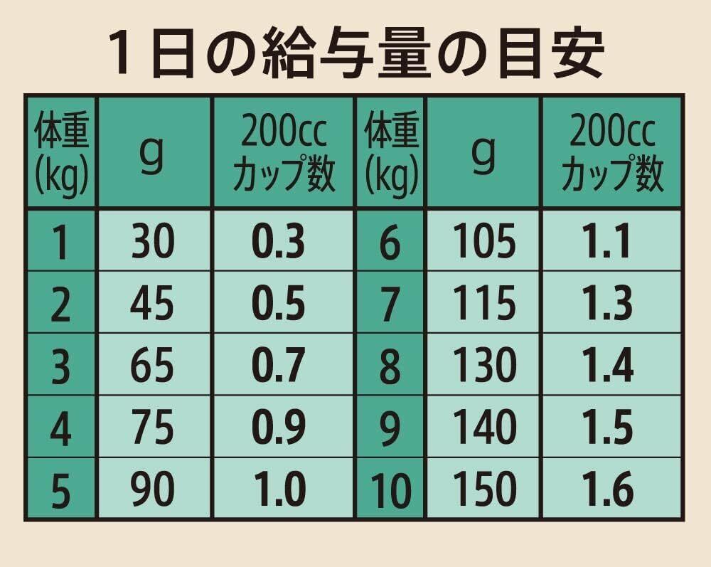 【給与量】1日の給与量の目安 体重 1kg:30g(200㏄カップ0.3)、2kg:45g(200㏄カップ0.5)、3kg:65g(200㏄カップ0.7)、4kg:75g(200㏄カップ0.9)、5kg:90g(200㏄カップ1.0)、6kg:105g(200㏄カップ1.1)、7kg:115g(200㏄カップ1.3)、8kg:130g(200㏄カップ1.4)、9kg:140g(200㏄カップ1.5)、10kg:150g(200㏄カップ1.6)