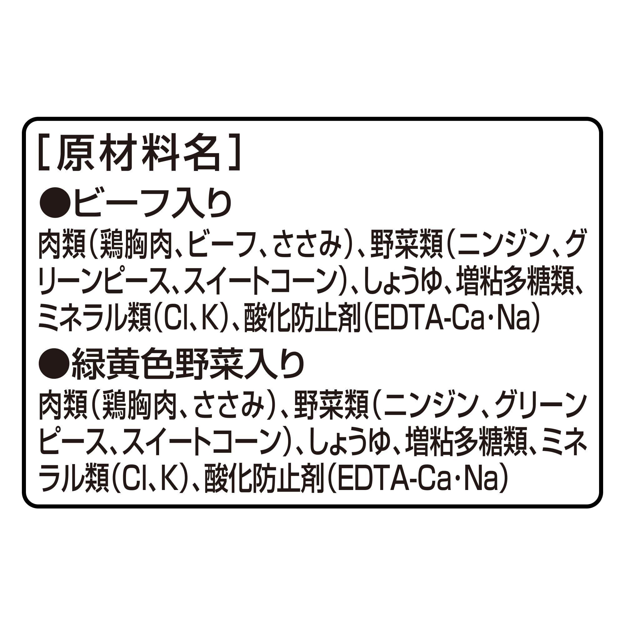 【原材料】●ビーフ入り:肉類(鶏胸肉、ビーフ、ささみ)、野菜類(ニンジン、グリーンピース、スイートコーン)、しょうゆ、増粘多糖類、ミネラル類(Cl、K)、酸化防止剤(EDTA-Ca・Na)●緑黄色野菜入り:肉類(鶏胸肉、ささみ)、野菜類(ニンジン、グリーンピース、スイートコーン)、しょうゆ、増粘多糖類、ミネラル類(Cl、K)、酸化防止剤(EDTA-Ca・Na)【保証成分】タンパク質:6.5%以上、脂質:1.0%以上、粗繊維:1.0%以下、粗灰分:1.5%以下、水分:90.0%以下【エネルギー】カロリー:約45kcal/1袋あたり