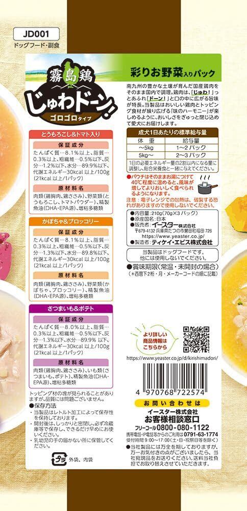 南九州で育った国産鶏肉のじゅわドーン!な旨味を愛犬にお届け鶏肉と彩りお野菜の味が楽しめる3種類のパウチが入ったバラエティーパック。お野菜が大好きな愛犬にオススメ!大きな角切りカットの鶏肉が入ったゴロゴロタイプ。噛めば噛むほど鶏肉の旨味がじゅわと溢れ、ドーンと口の中に広がる贅沢な味わい。