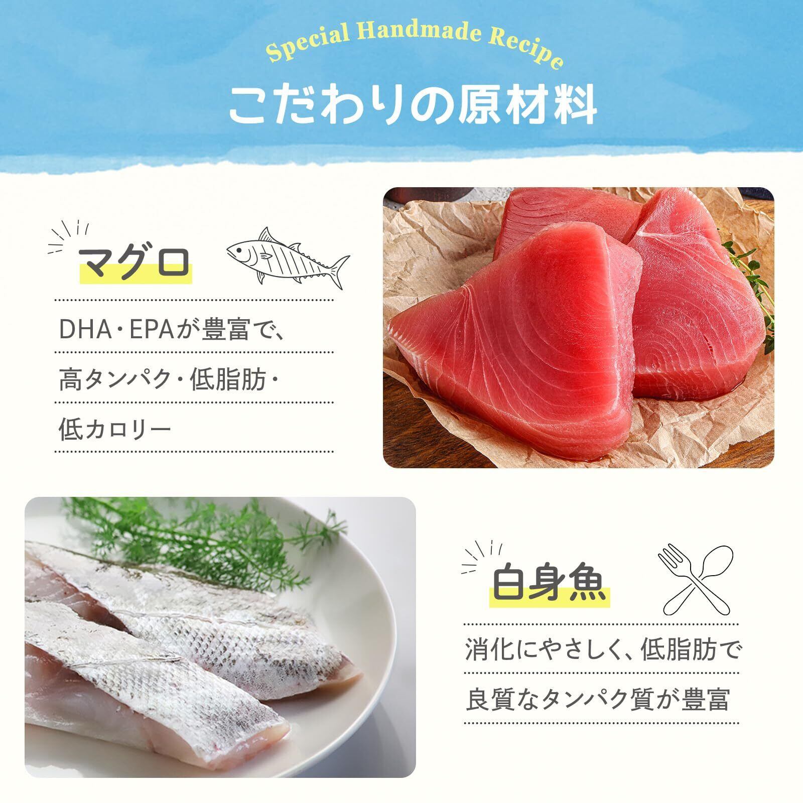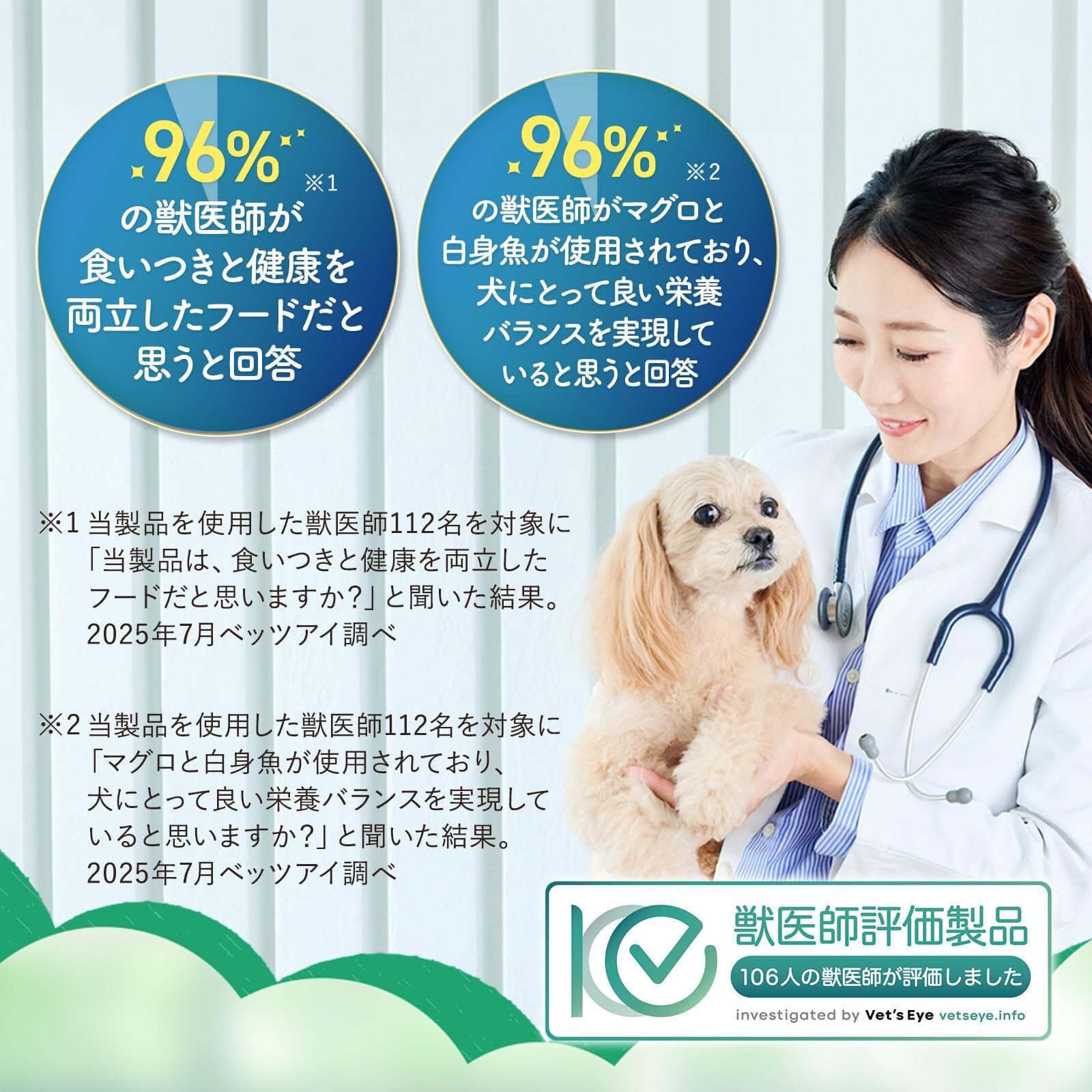 【動物性タンパク源50%以上!】高品質なマグロ・白身魚をふんだんに使っているため、香りが良く、愛犬も喜ぶ美味しさです。